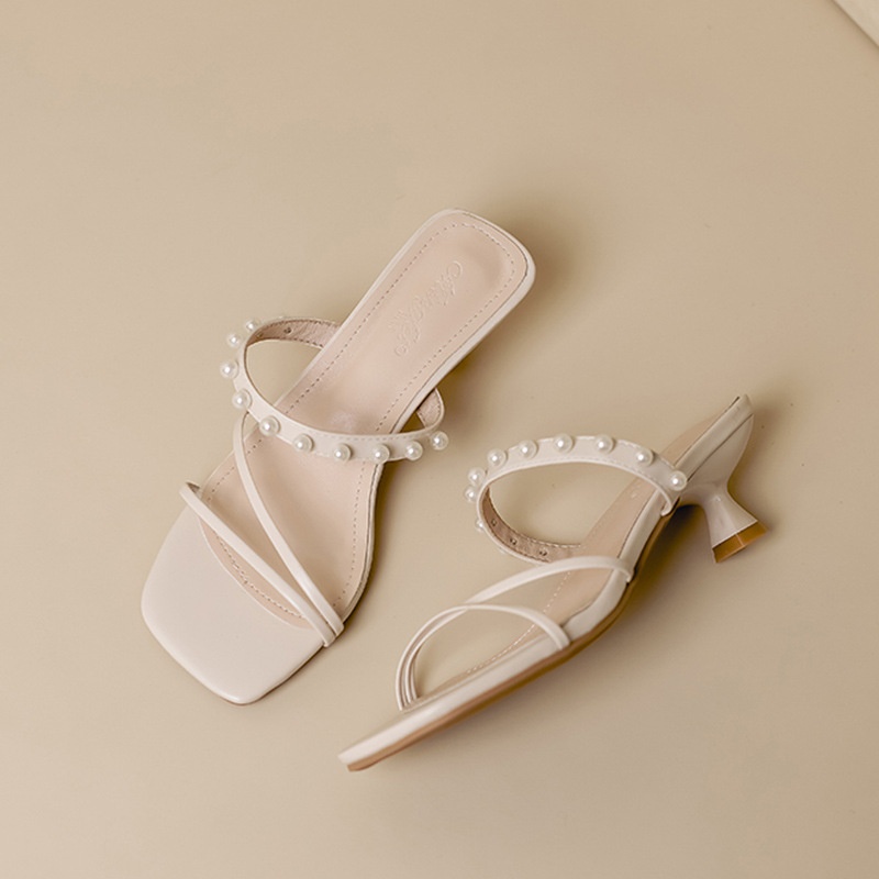 Summer Style Stiletto Sandals For Women Mid-heel Sandals Fashionable Outdoor Slippers Gentle Pearl French Evening Style