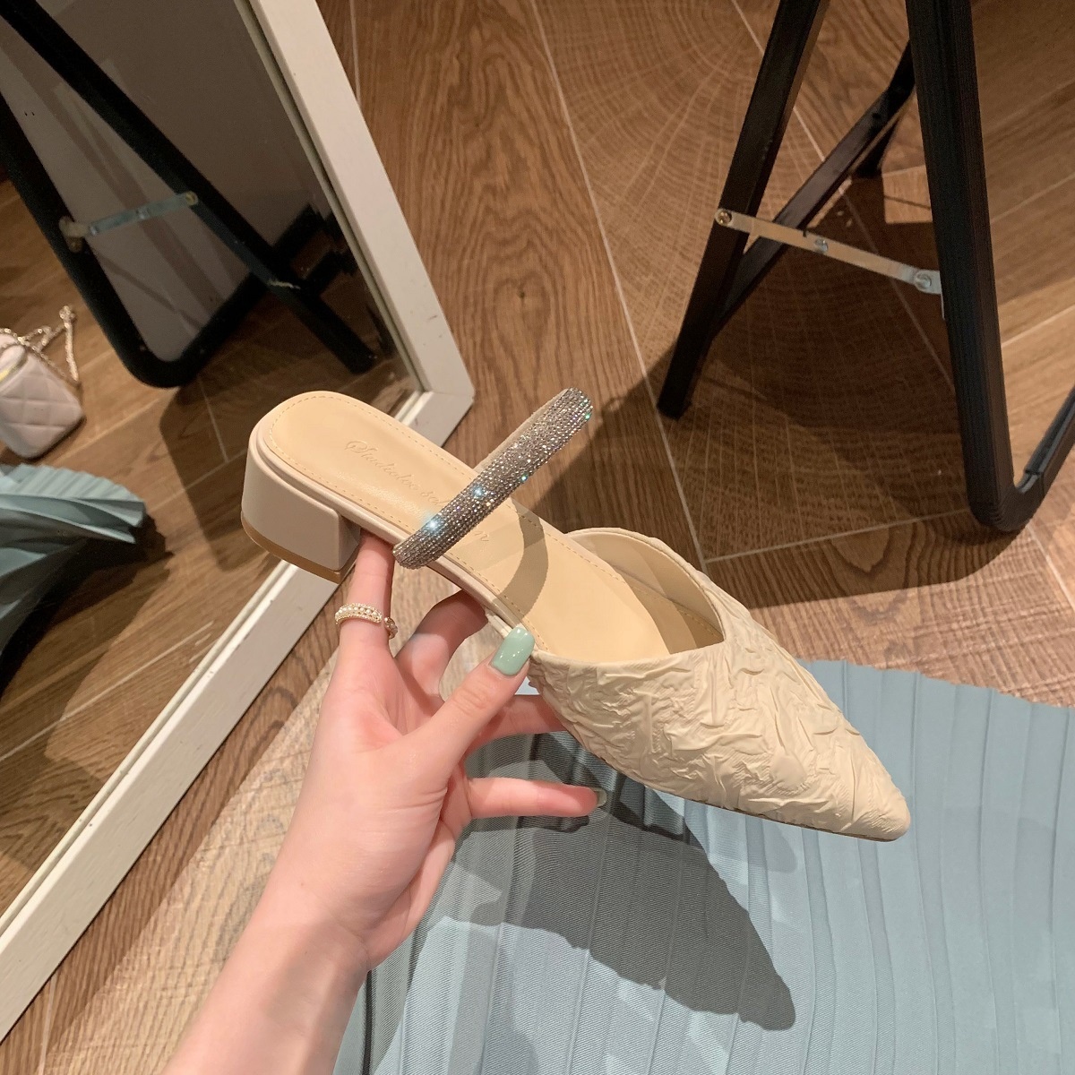 Su Yinyin Spring Gentle Style One-line Diamond With Pointed Toe Empty Back Thick Heel Sandals Women's High Heel Single Shoes