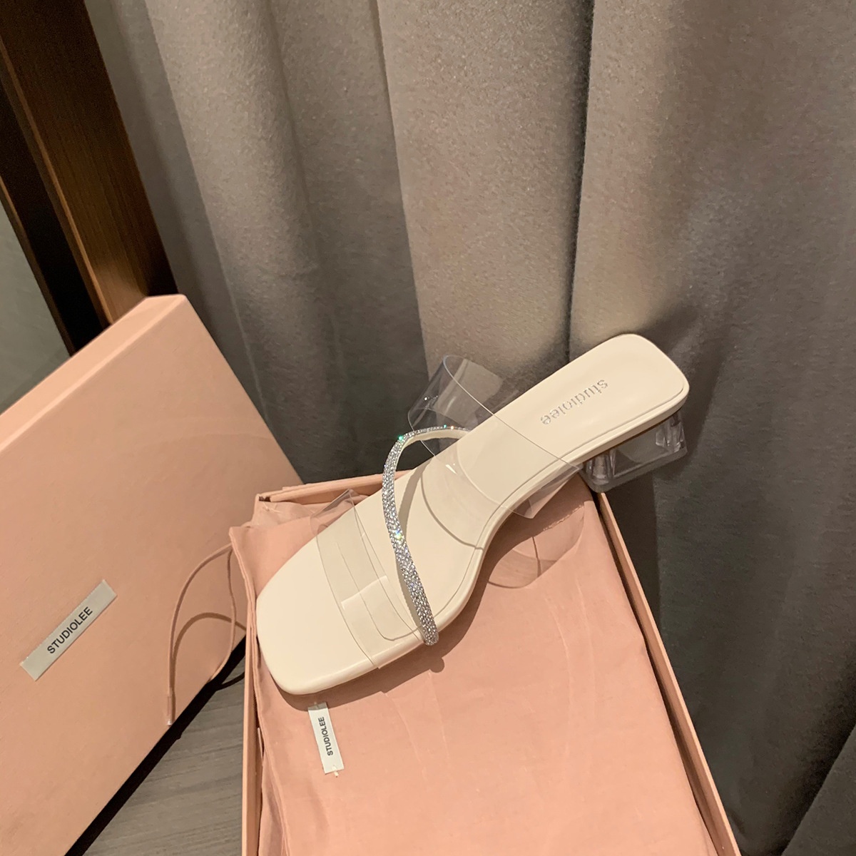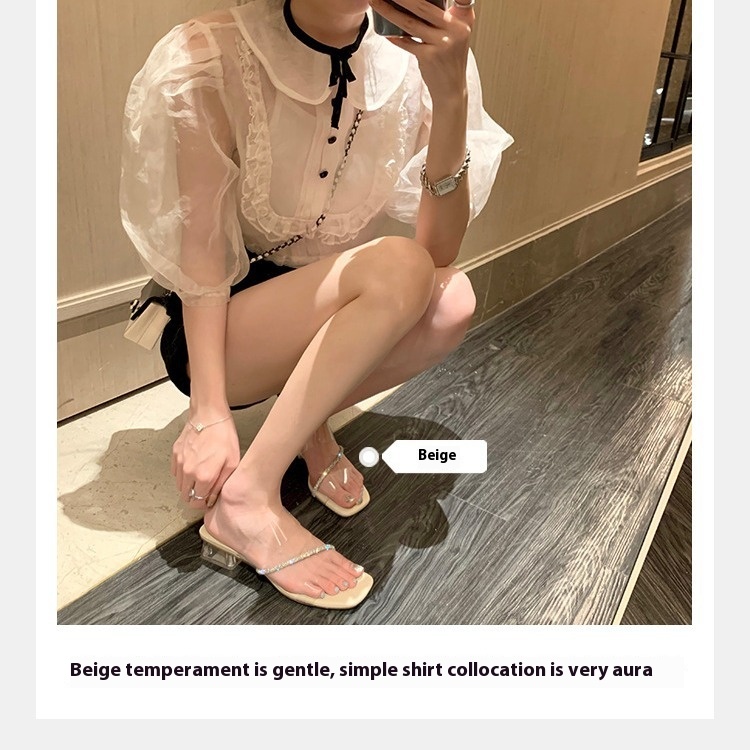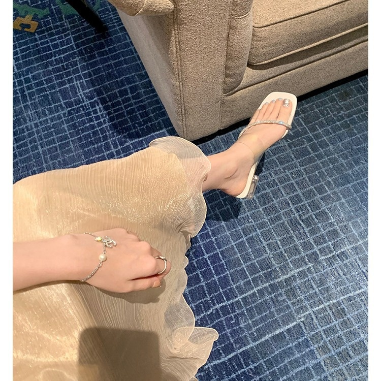 Su Yinyin Spring Gentle Style One-line Diamond With Pointed Toe Empty Back Thick Heel Sandals Women's High Heel Single Shoes
