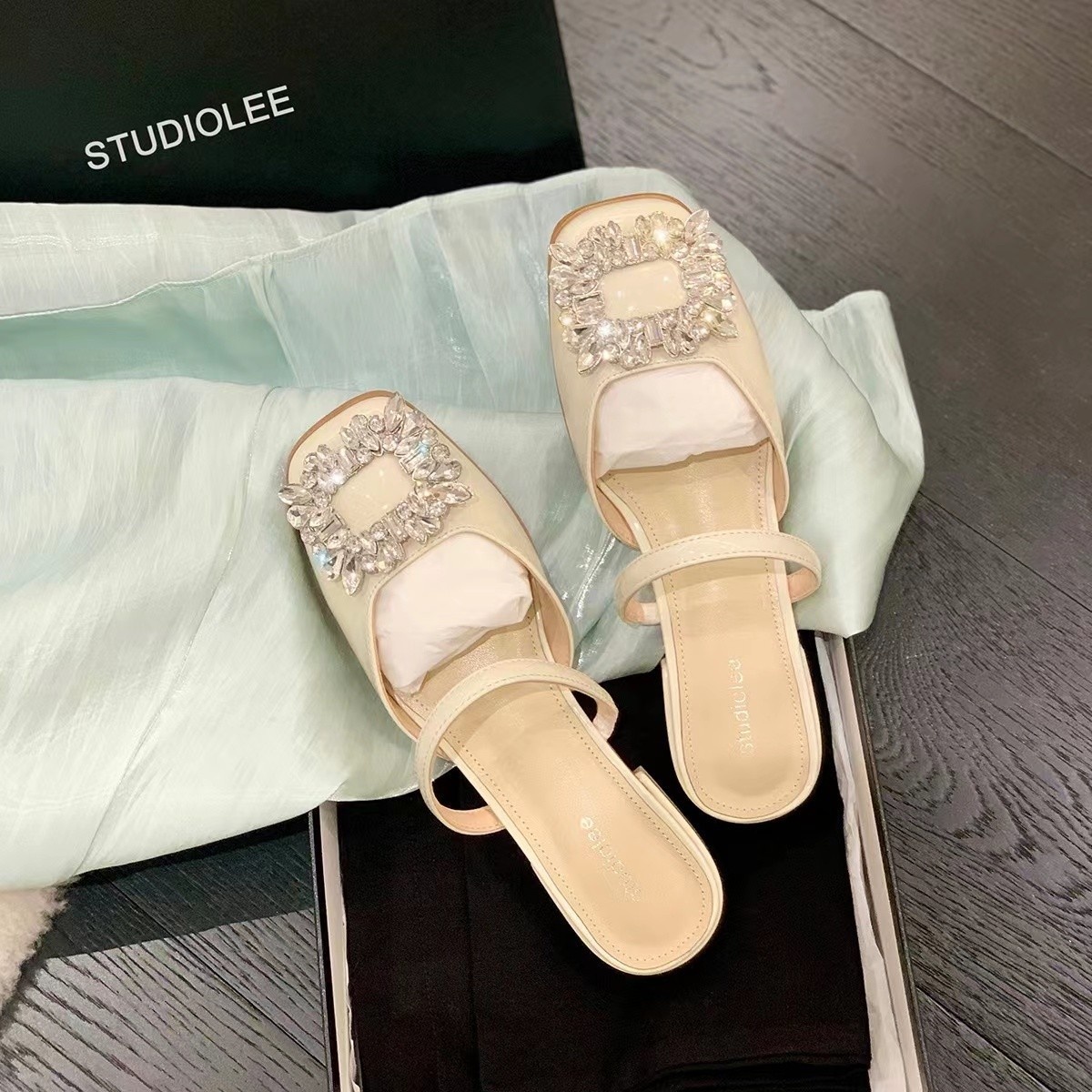 Su Yinyin Spring Sexy Rhinestone Flat Sandals Women's Shallow Mouth Square Head Mary Jane Sandals