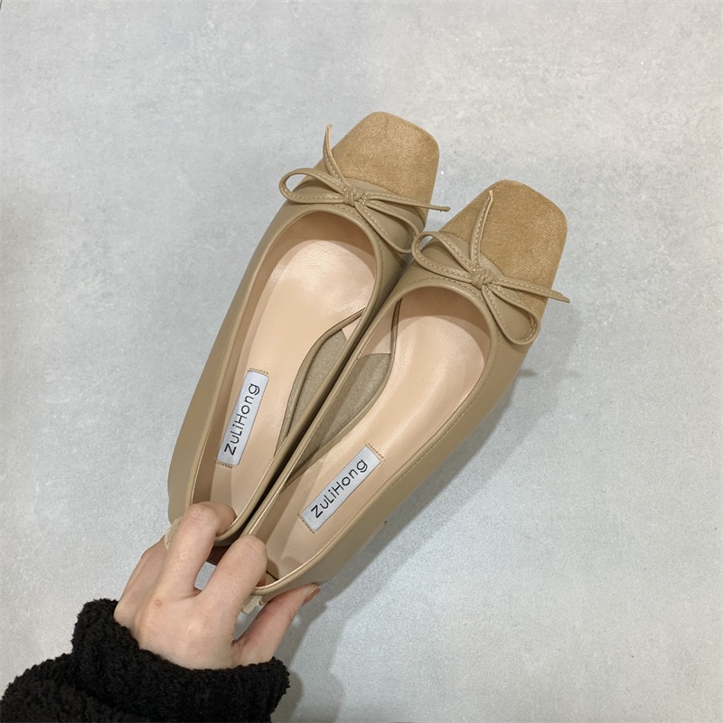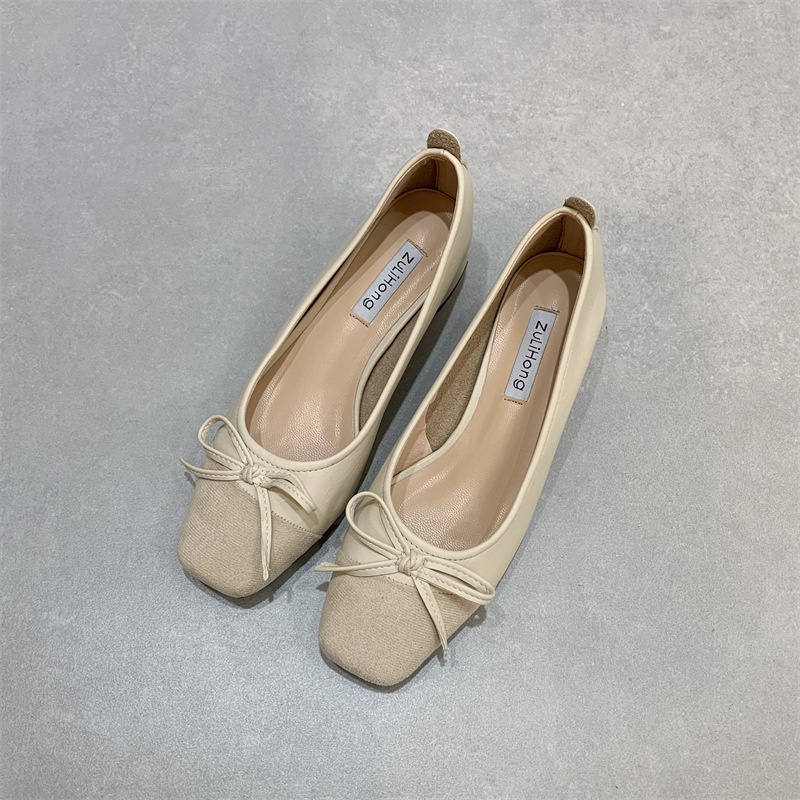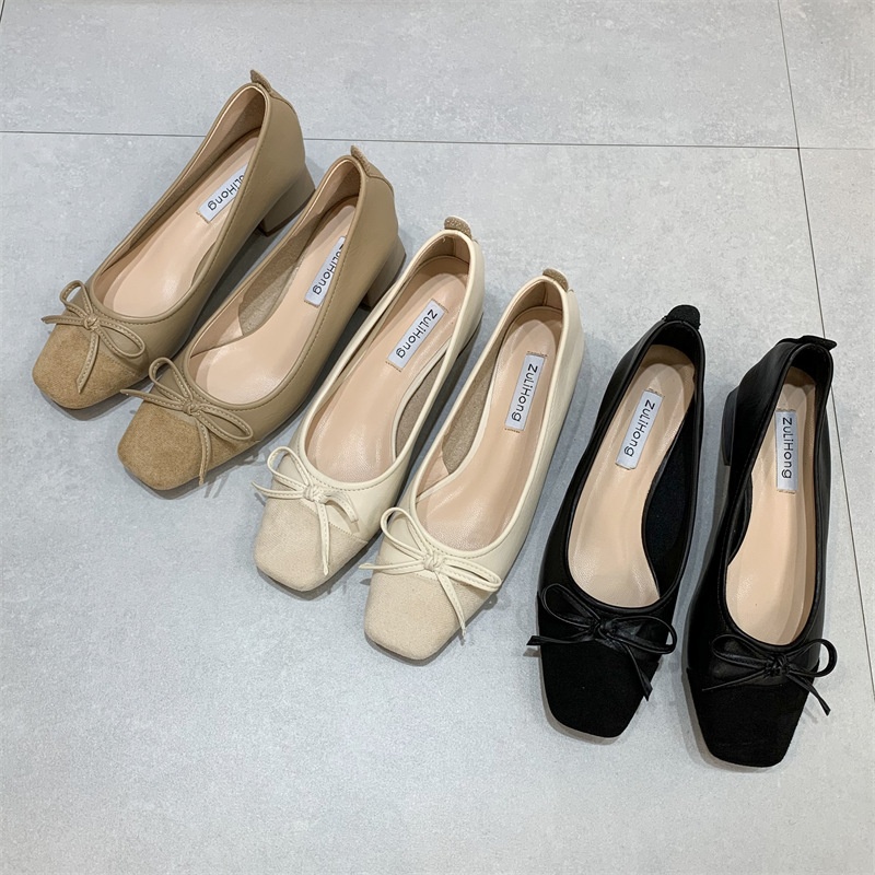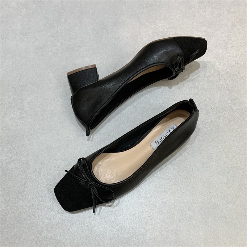Bowknot Shallow-mouth Shoes For Women Thick Heels Spring Style Fairy Style Square Toe Slim Mid-heel Grandma Shoes