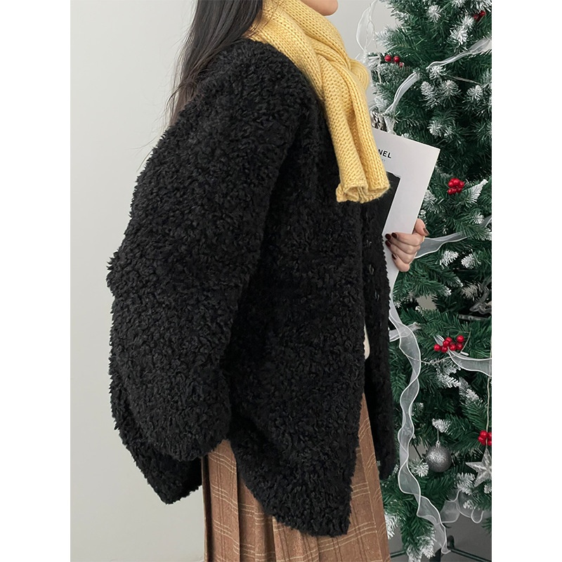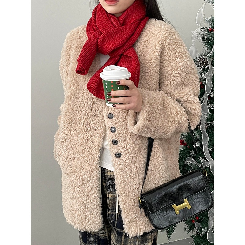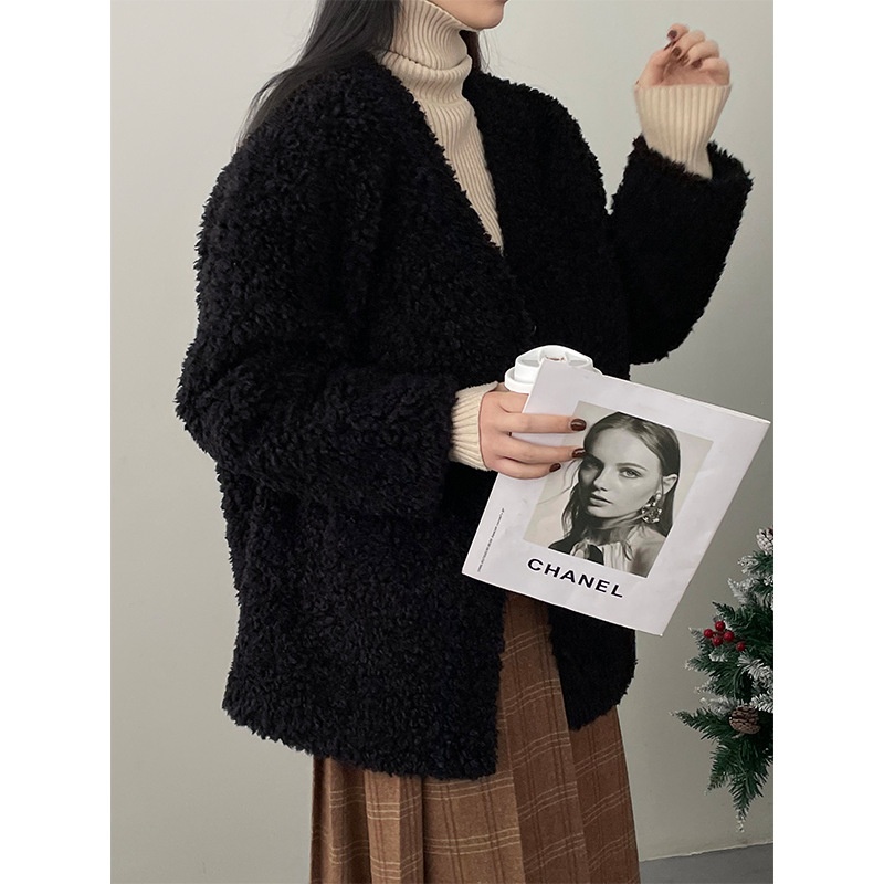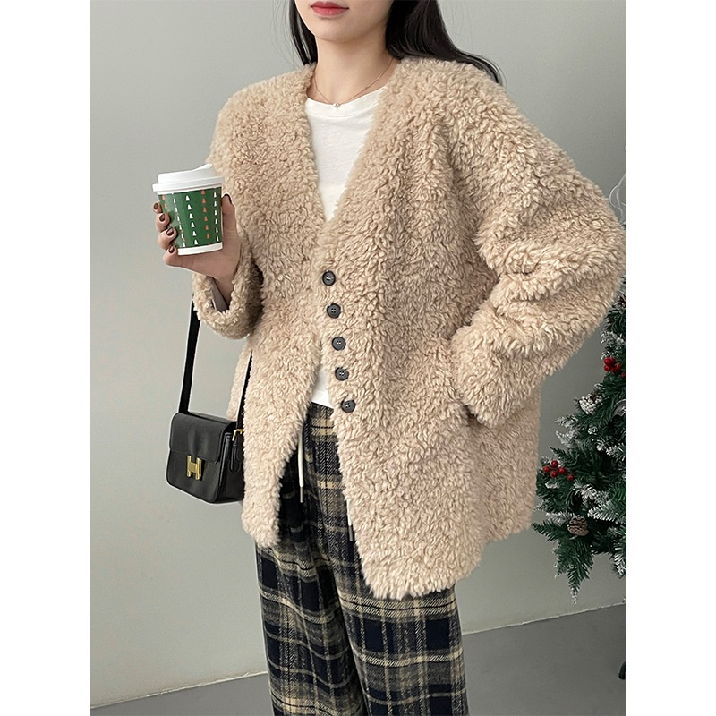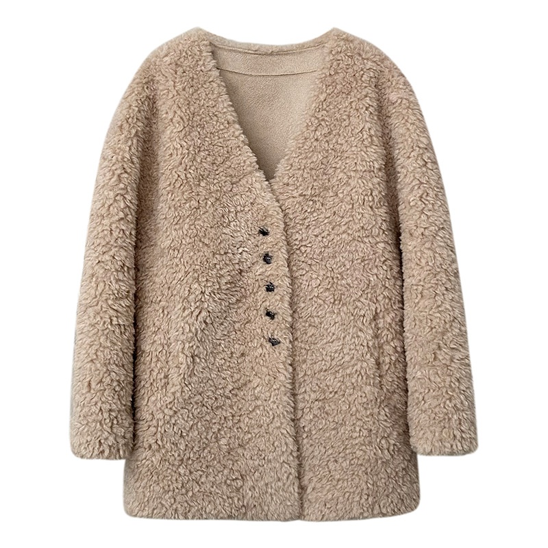 Taochuan[Winter Bear]Grain Fleece Lambskin Fur Coat Women's Medium Length V-Neck Top31082