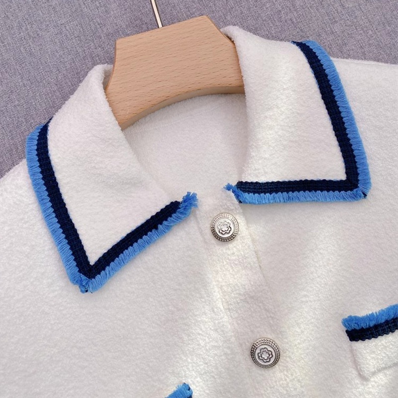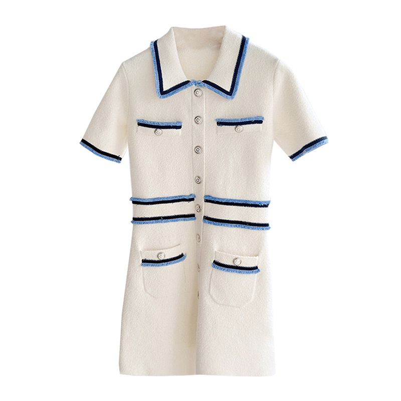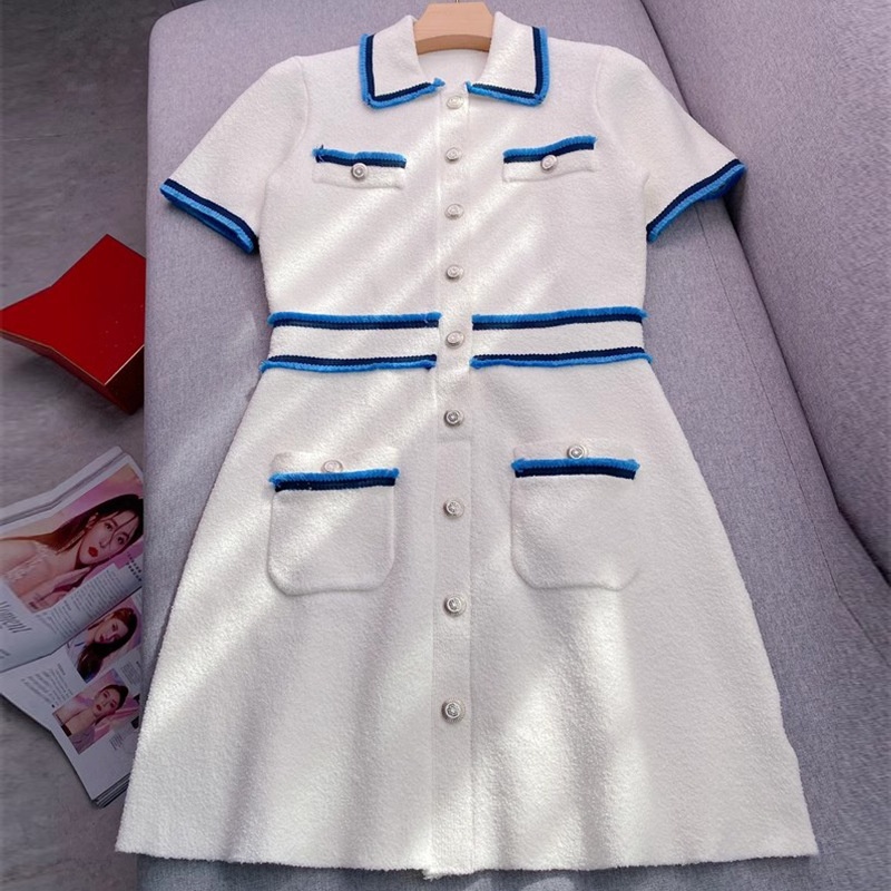 French Single MHouse Spring And Summer Contrast Color Piping Knitted Dress Short Sleeve Small Chanel Style Waist A-line Skirt
