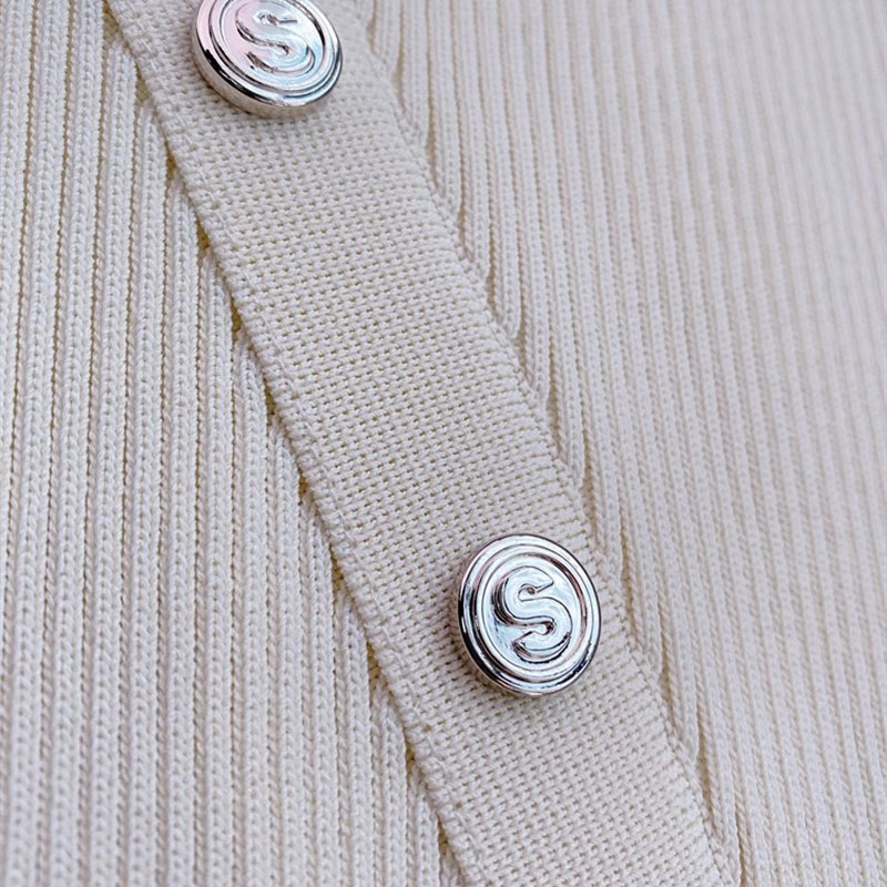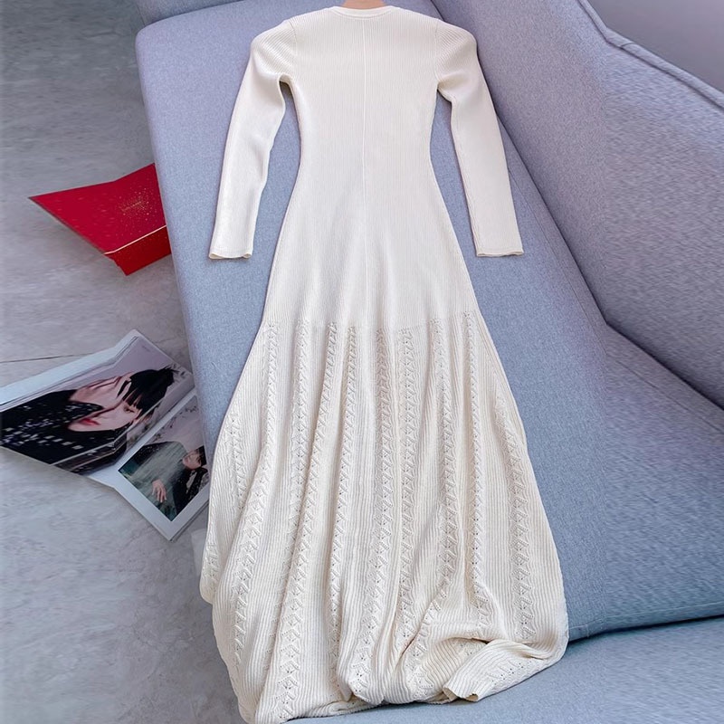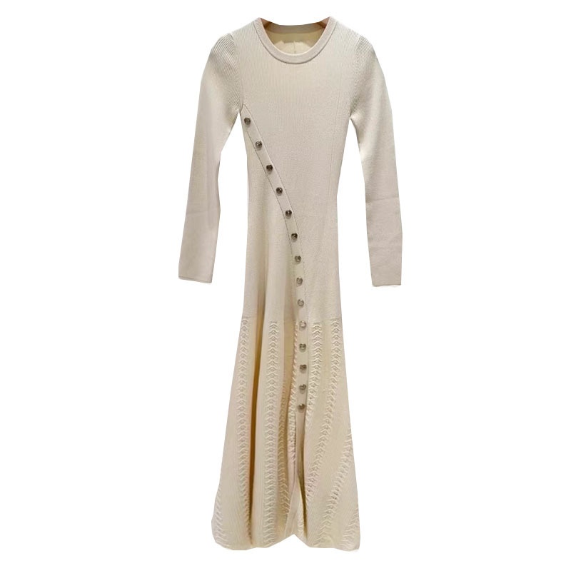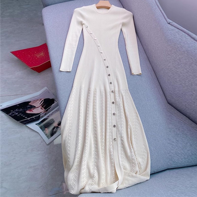 French Single SHome Early Spring Irregular Single-breasted Knitted Dress Round Neck Long Sleeves Long A-line Long Skirt