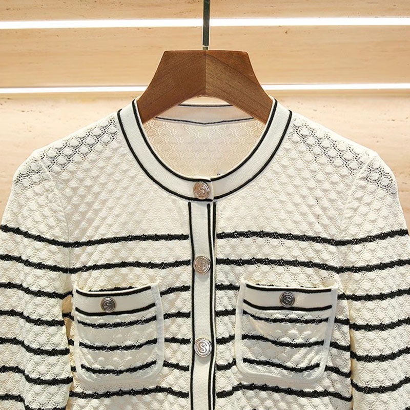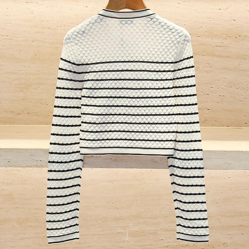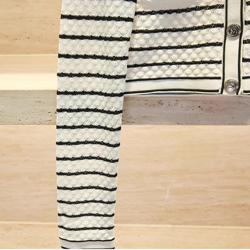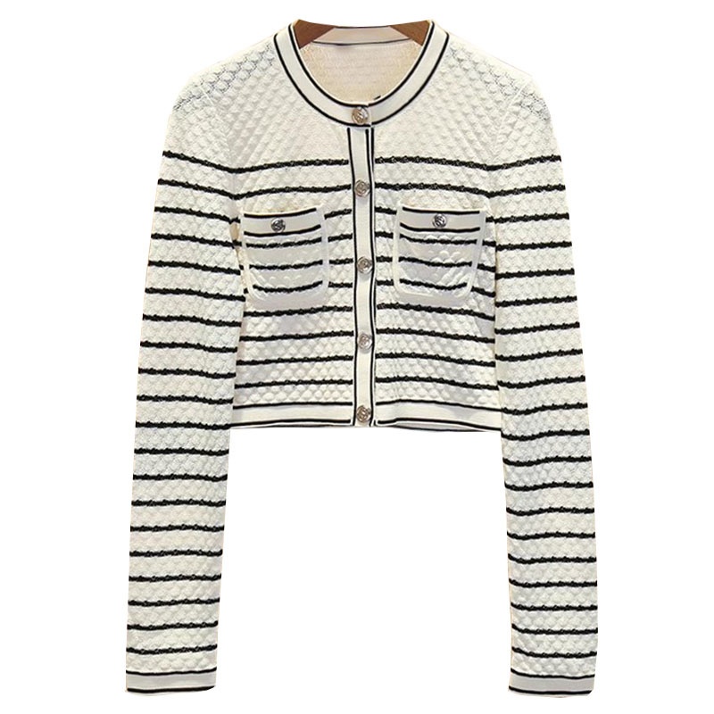 French Single SHome Early Spring Round Neck Striped Knitted Cardigan Women's Slim Short Small Sweater Jacket