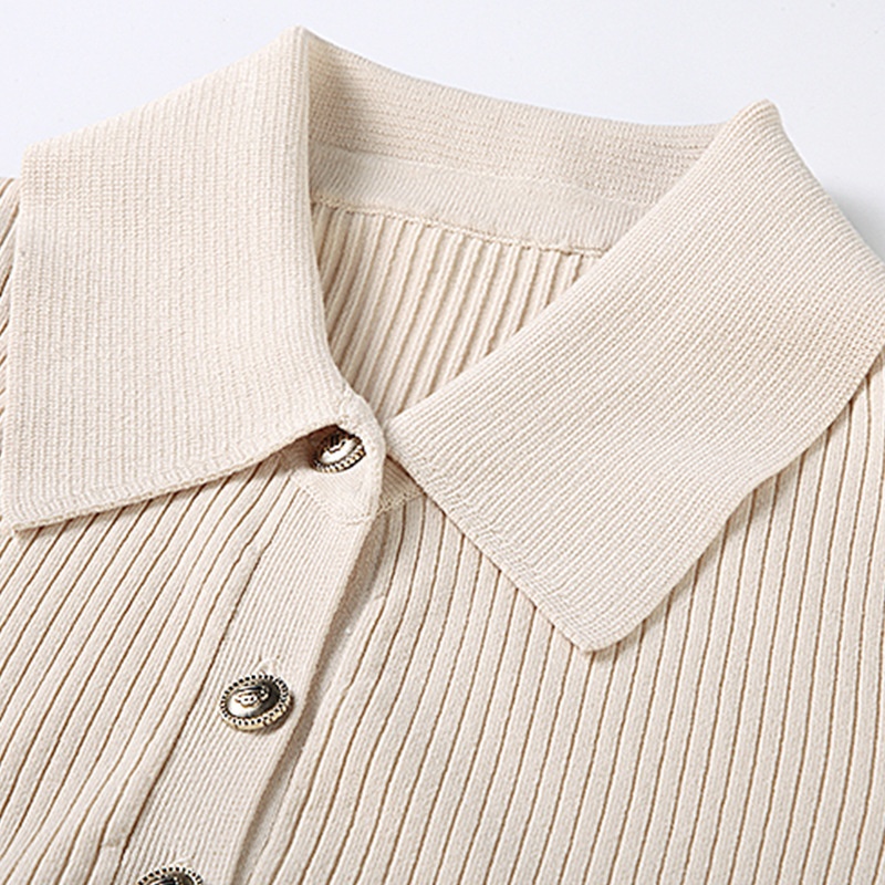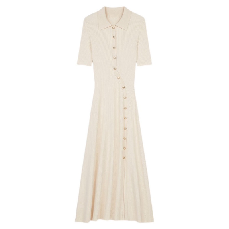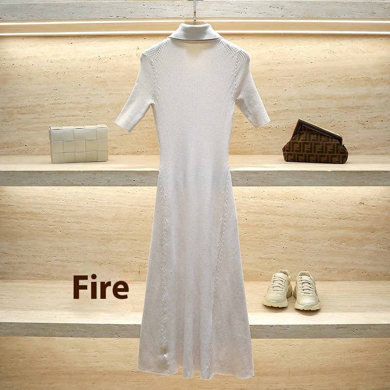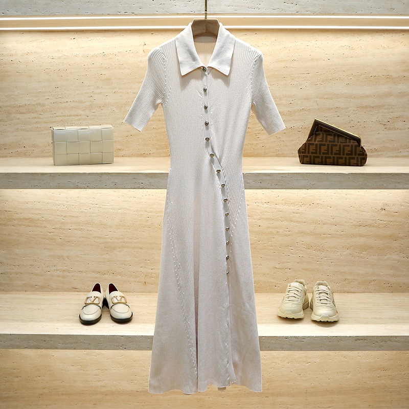 French MHome Spring And Summer Asymmetric Knitted Dress Female Lapel Slim Fit Short-sleeved Long Skirt