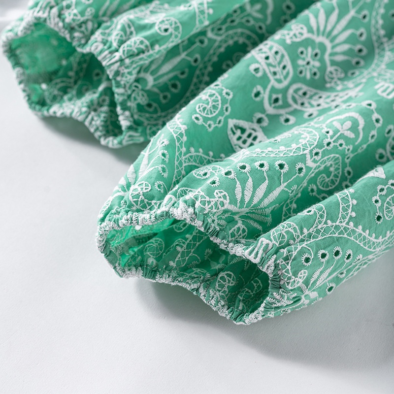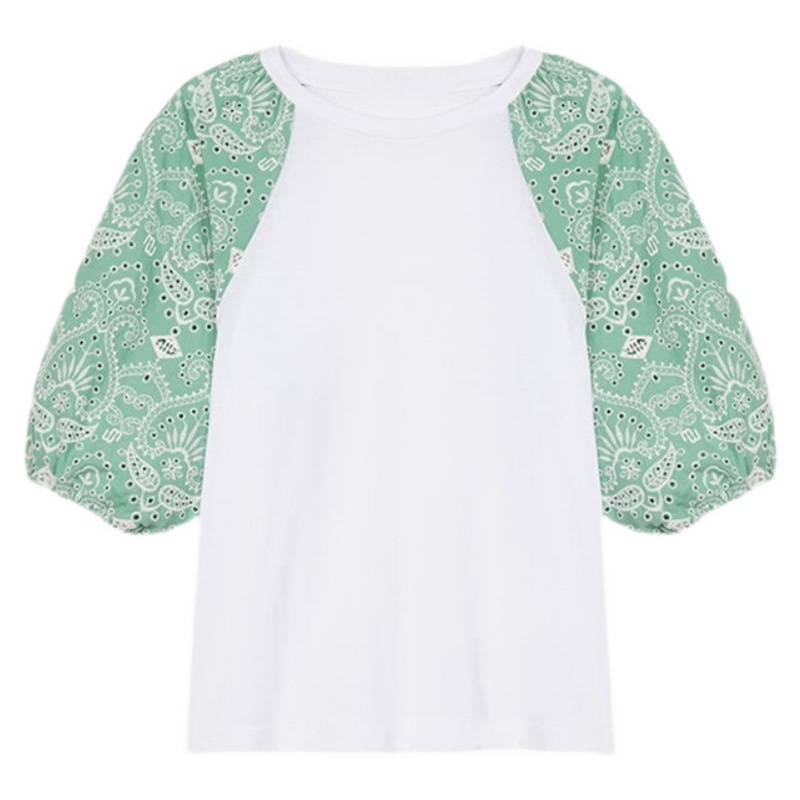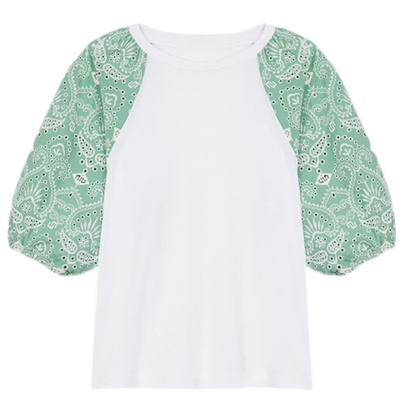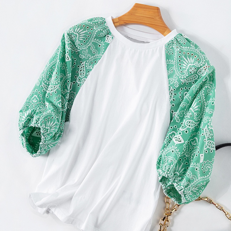 French Single MHome Summer Color Matching Embroidery Lantern Sleeve T-shirt Women's Round Neck Cotton Short-sleeved T-shirt Top