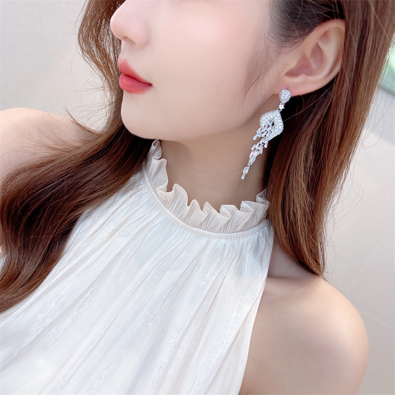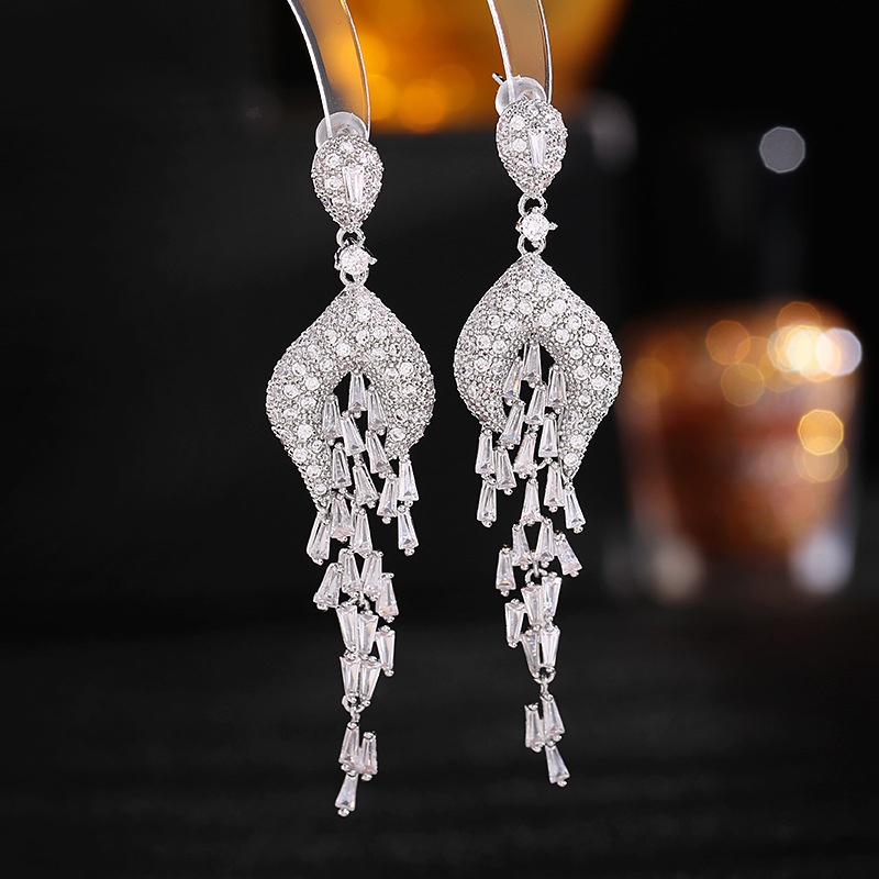 S925 Silver Needle Zircon Inlaid Bride Wedding Dinner Dress With Earrings Light Luxury Fashion Long Tassel Earrings