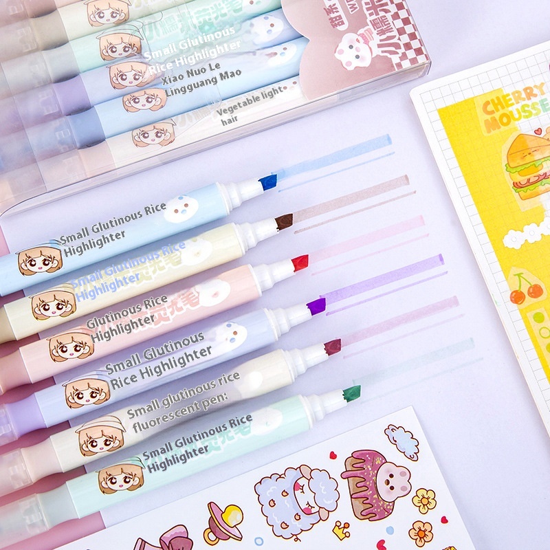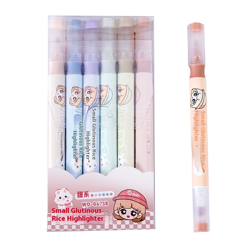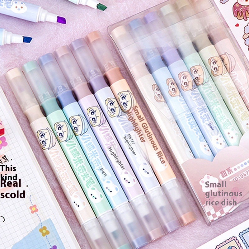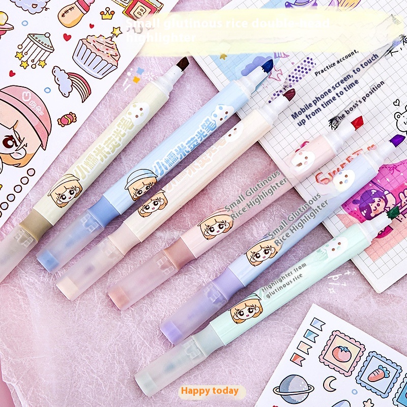 Cartoon Small Glutinous Rice Double-headed Fluorescent Pen Student Color Graffiti Handbook Pen Light Color Eye Protection Key Mark Pen