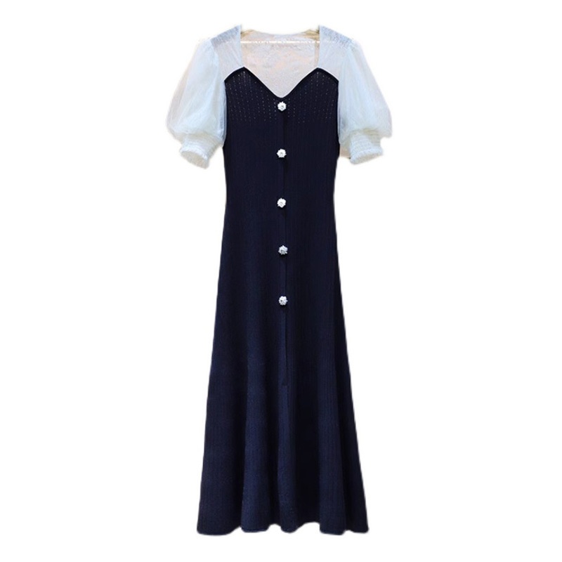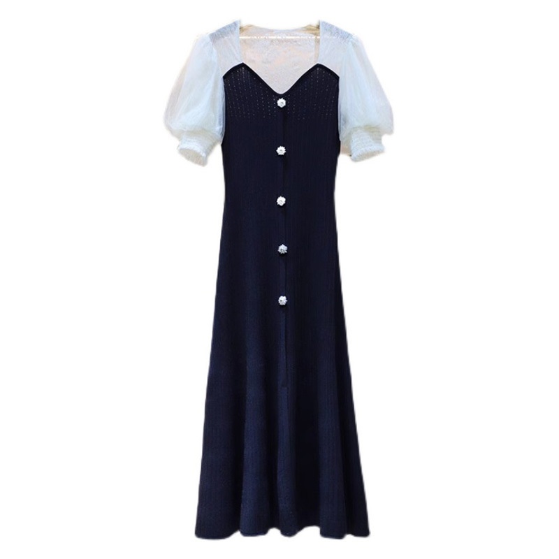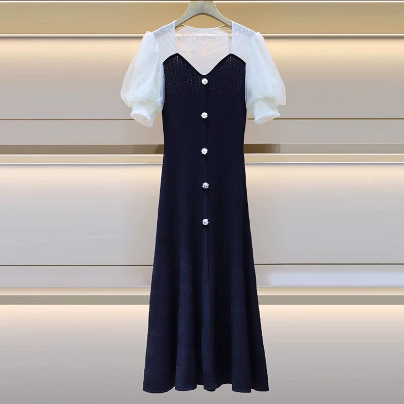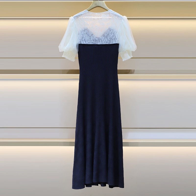 Zhuojia Summer Lace Splicing V-neck Short-sleeved Knitted Dress Puff Sleeves Long Waist Long Skirt