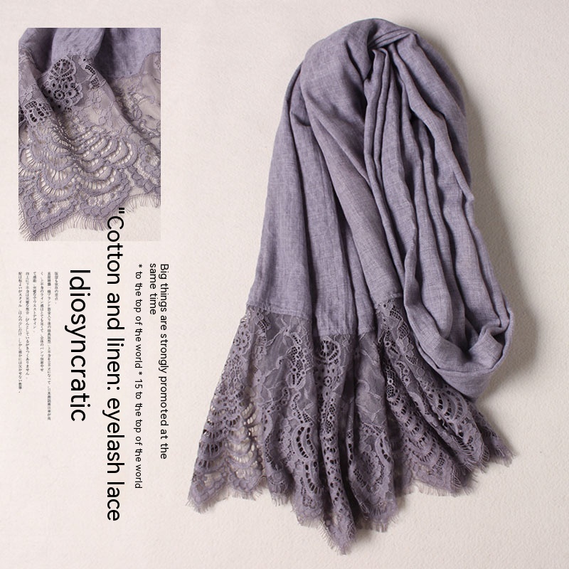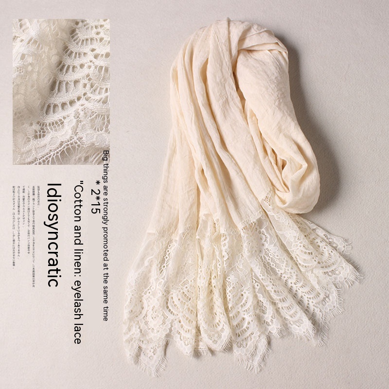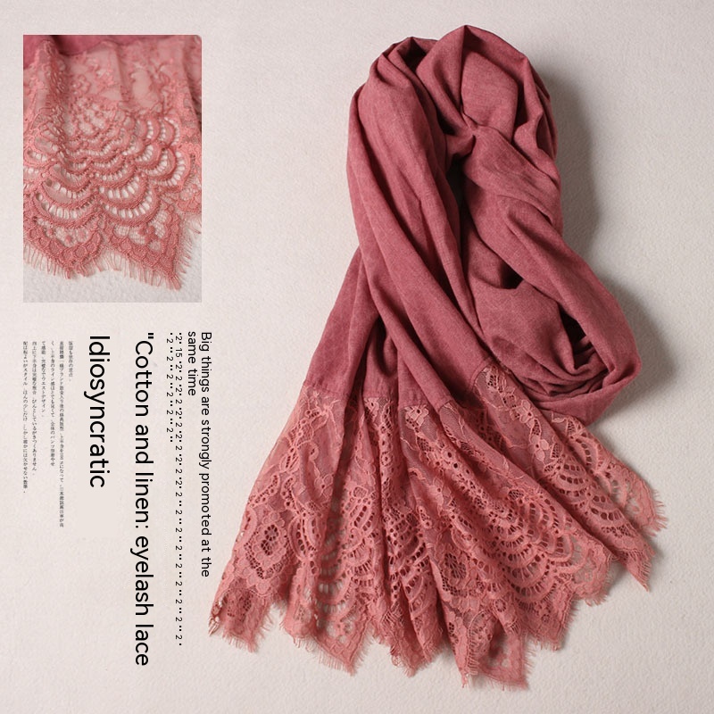 Cotton And Linen Scarf For Women Spring Solid Color Lace Splicing Hem Eyelashes Red Literary Style