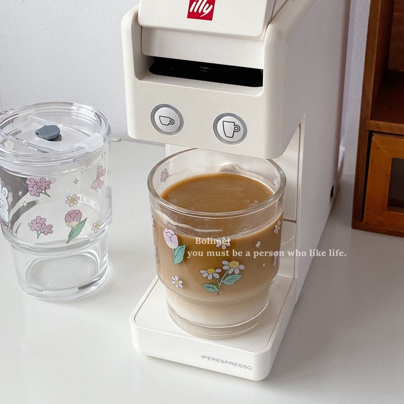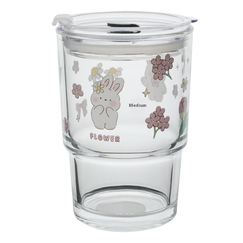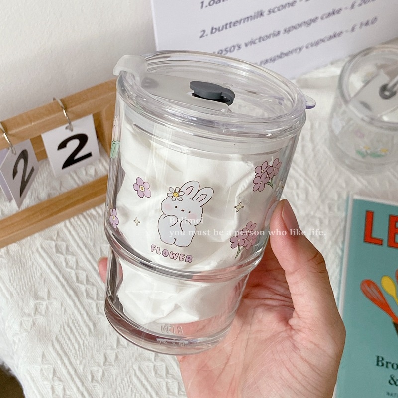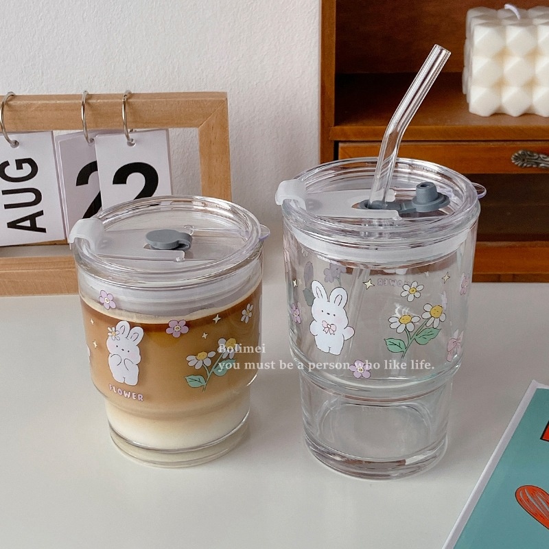 Bolimei Flower Rabbit Glass Straw Cup Girl Heart Glass Water Cup Milk Tea Cup Student Covered Cup