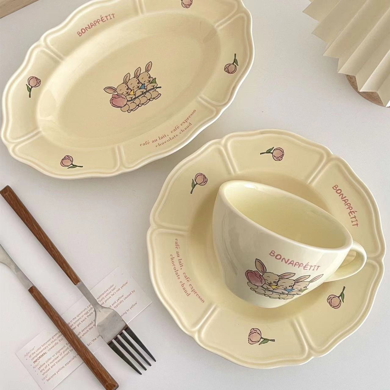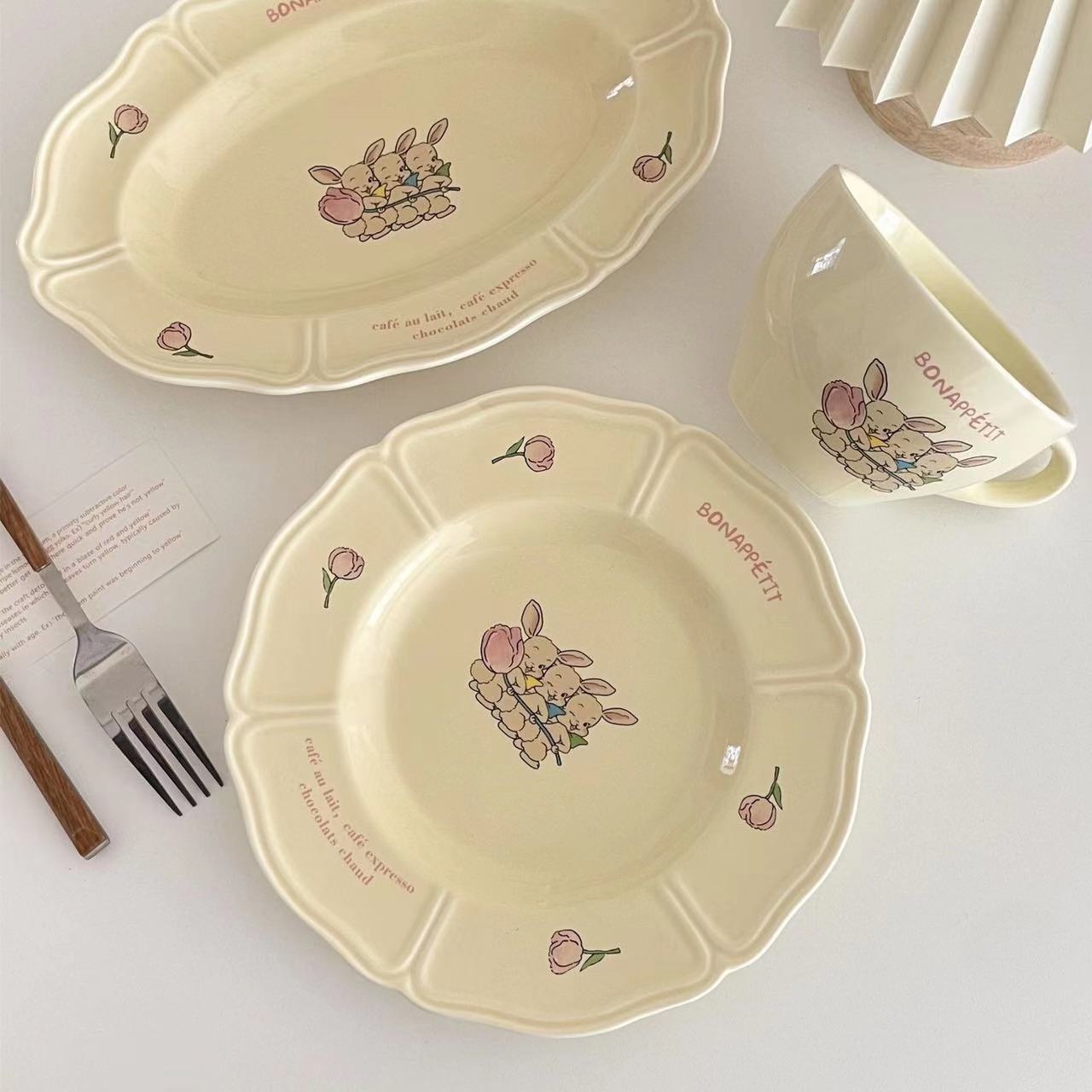 Bolimei Korean Retro French Ceramic Plate Tulip Cream Lace Plate Ceramic Tableware Oval Plate