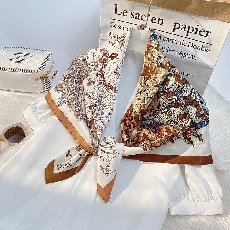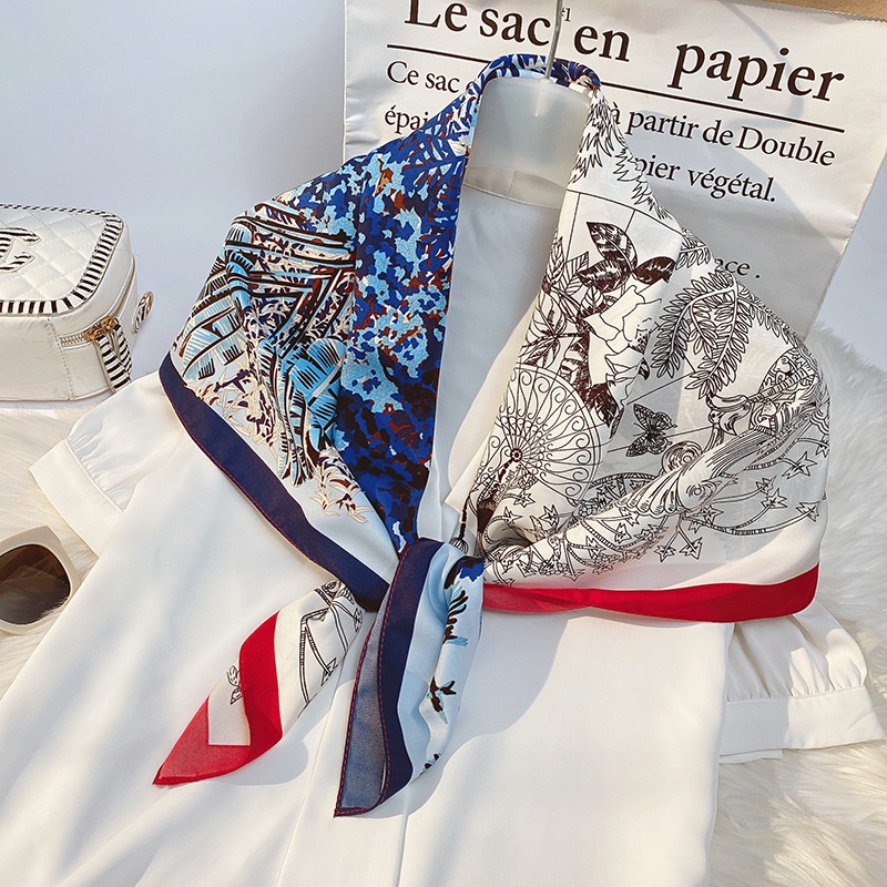 Spring And Summer Silk Scarf Small Square Scarf Fashion Sweet Simulation Silk Scarf Retro Curled Edge Printed Small Scarf For Women