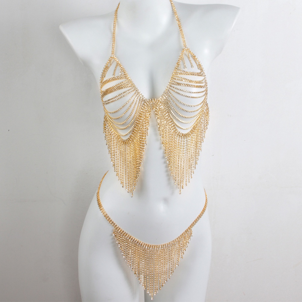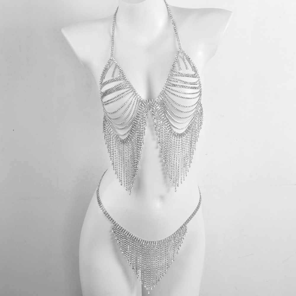 European And American Fashion Accessories Sexy Full Rhinestone Bikini Bra Set Nightclub Shiny Tassel Body Chain