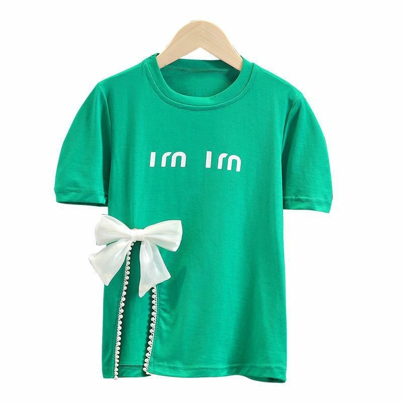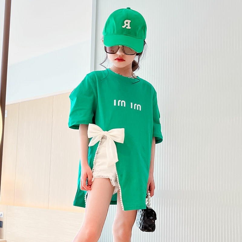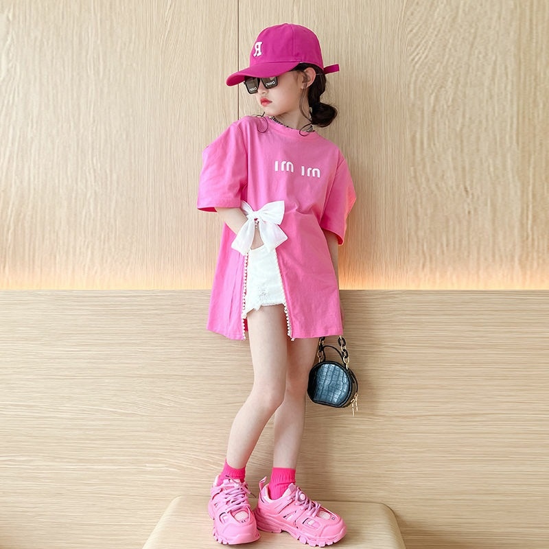 Girls Summer Short-sleeved T-shirt Baby Internet Celebrity Stylish Children's Personality Korean Version Of The Split Bow Mid-length Top