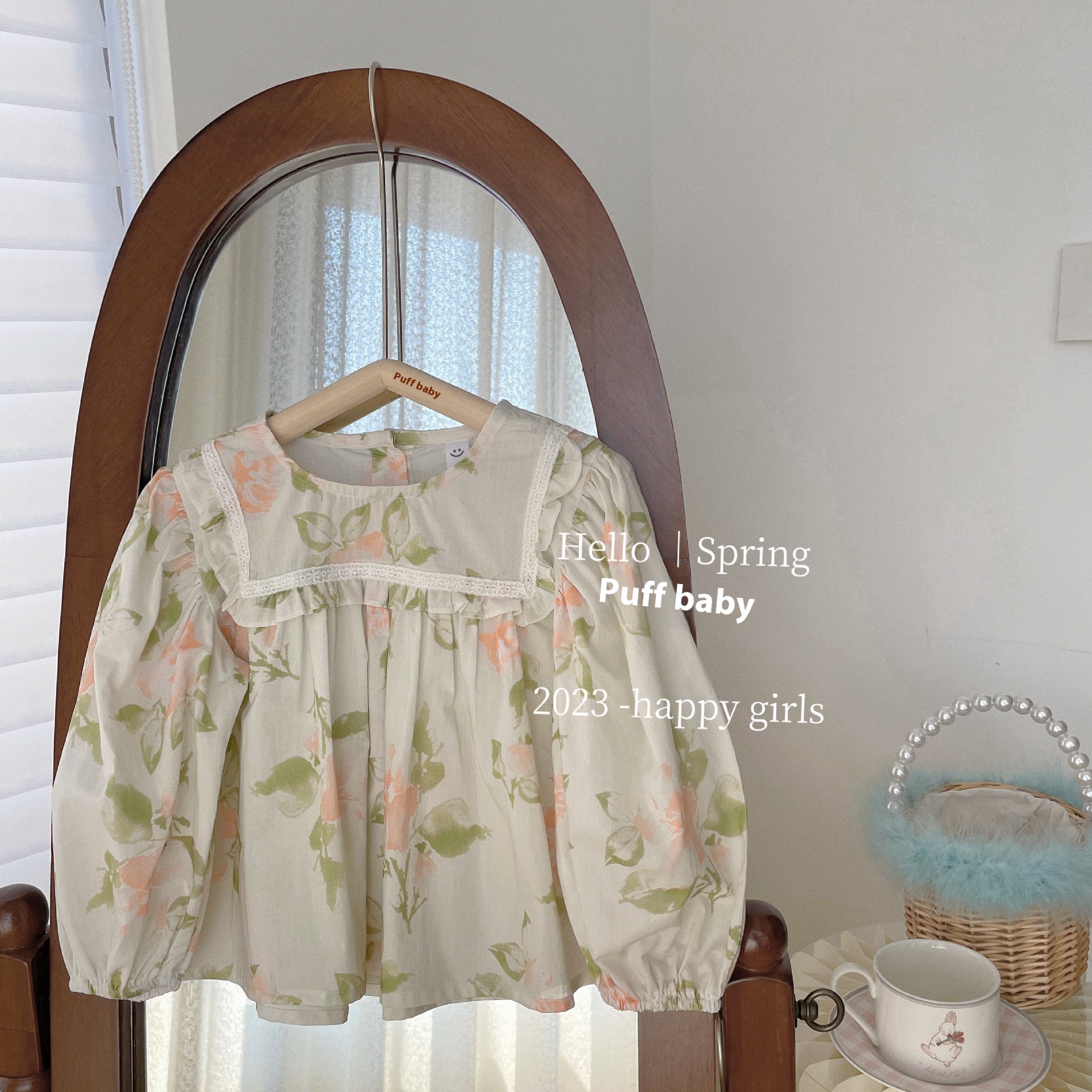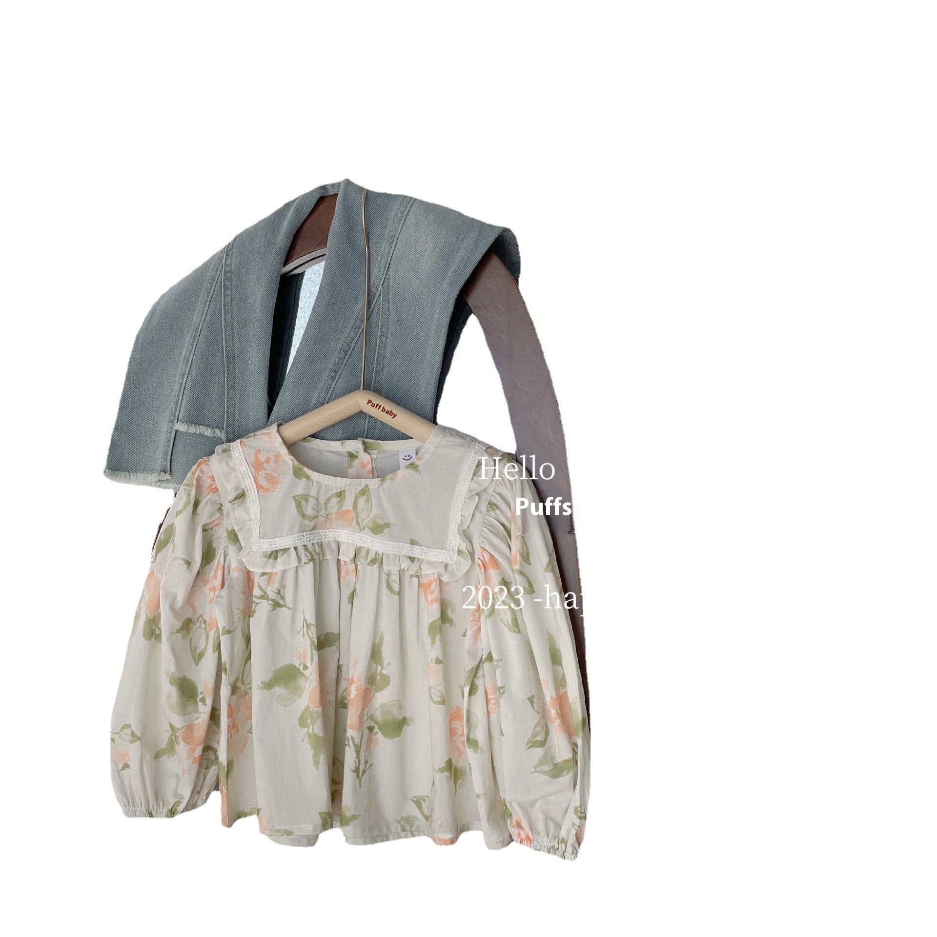 Korean Children's Clothing Girls Spring Suit Baby Stylish Flower Shirt Top Denim Flared Pants Two-piece Suit