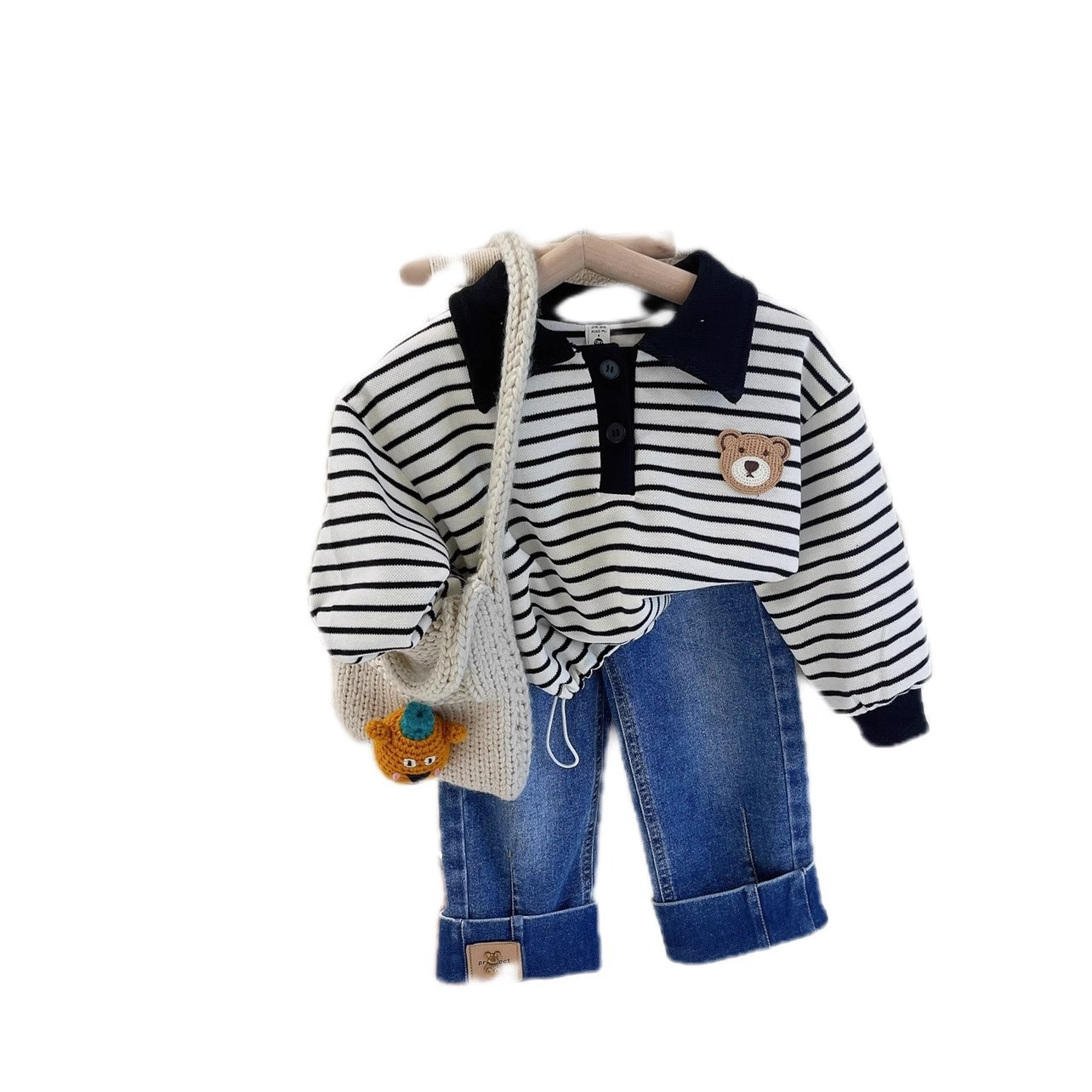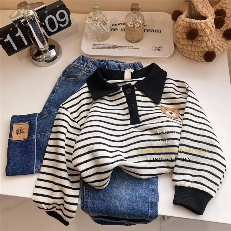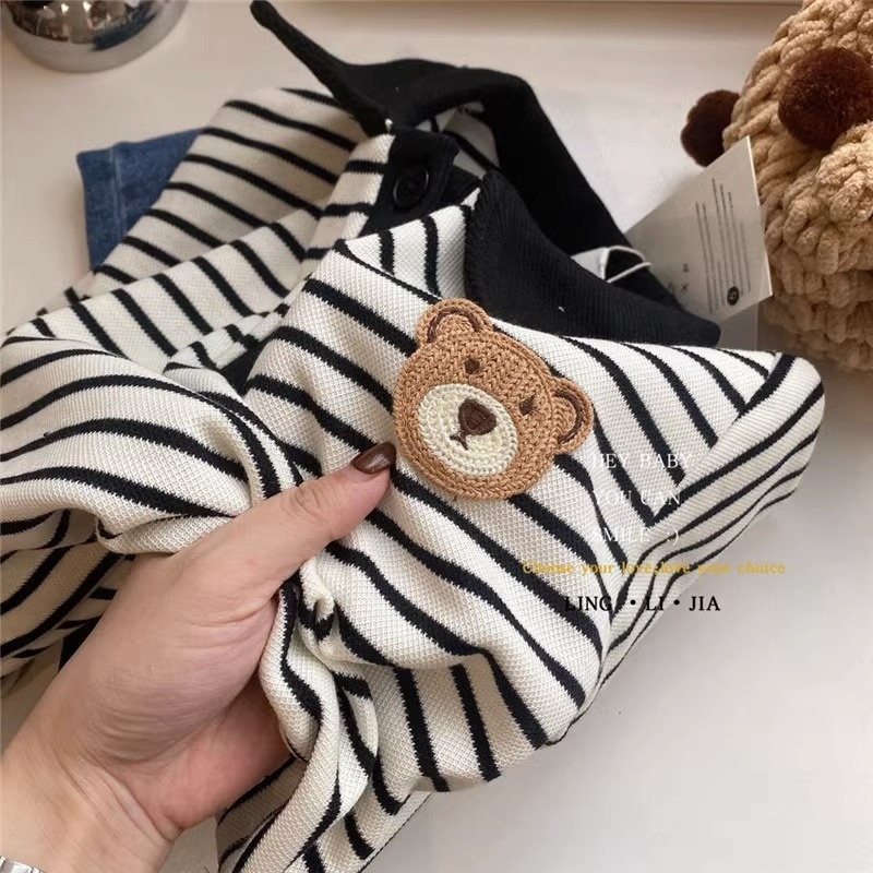 Embroidered Bear Lapel Striped Pullover Sweatshirt Autumn Short Style Fashionable Cute Loose Korean Casual Top