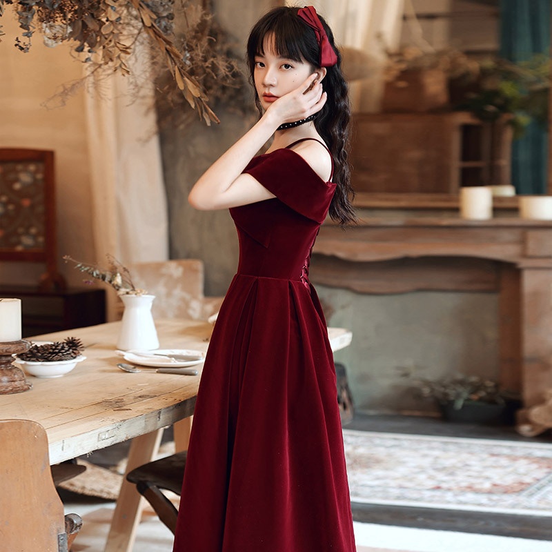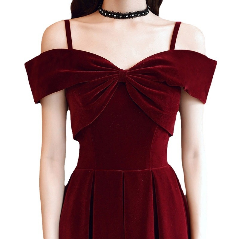 Burgundy Toast Dress Spring Bride Temperament Sling Velvet Engagement Dress Female Wedding Dress