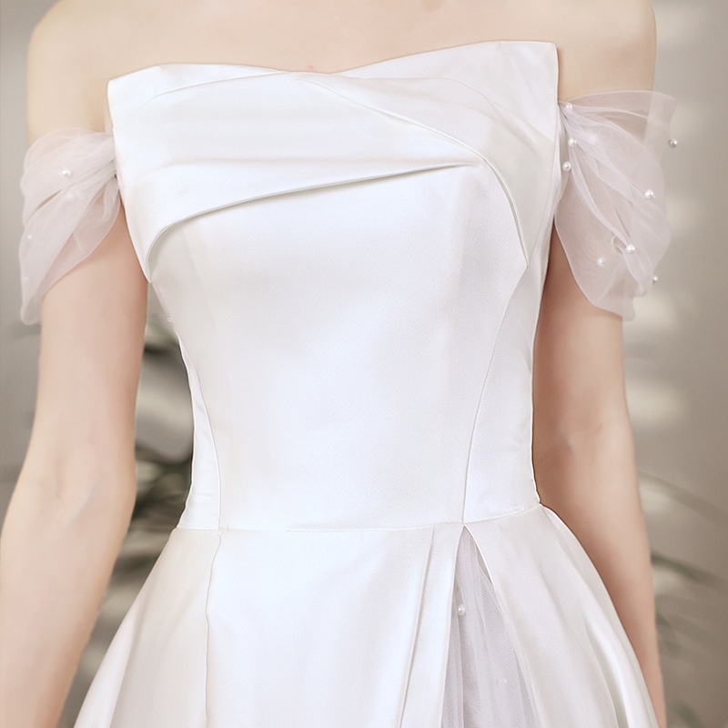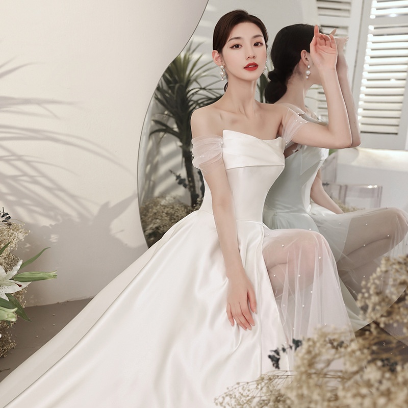 French Light Wedding Dress Satin Toast Dress Bride Wedding White Evening Dress Banquet One Shoulder Simple Temperament Travel Shoot