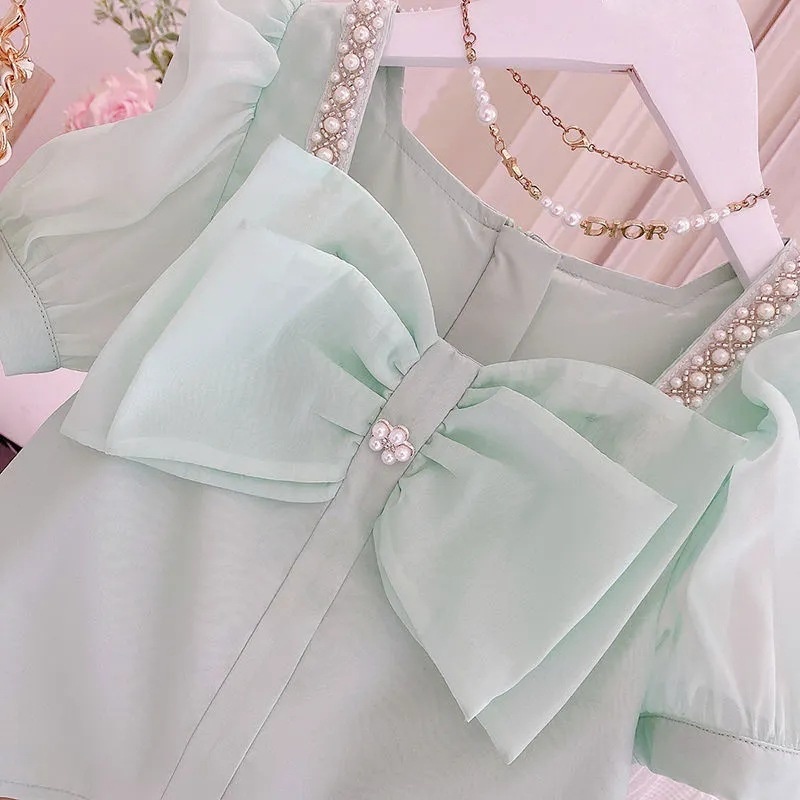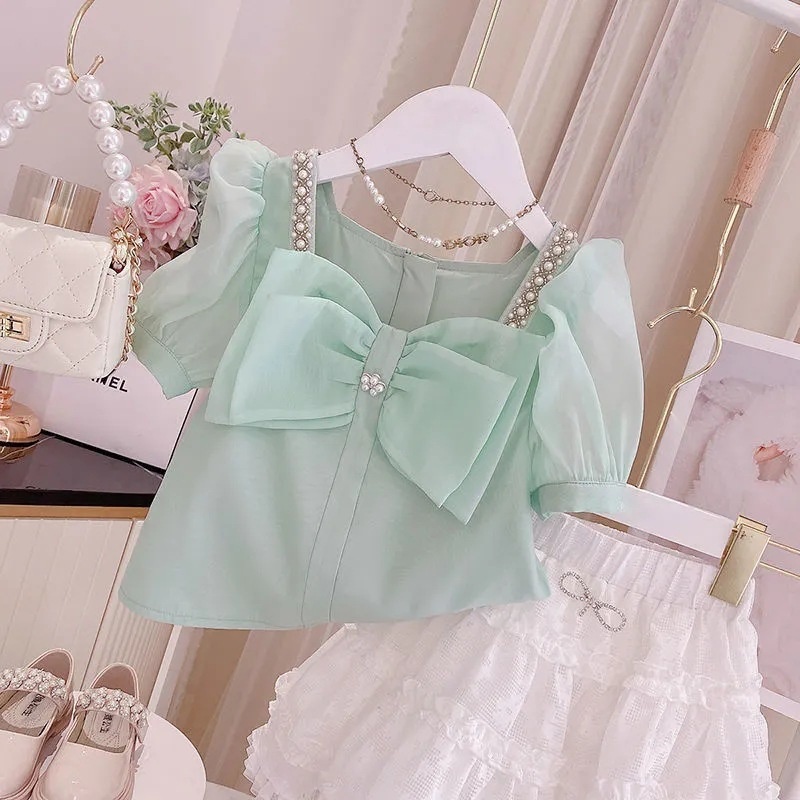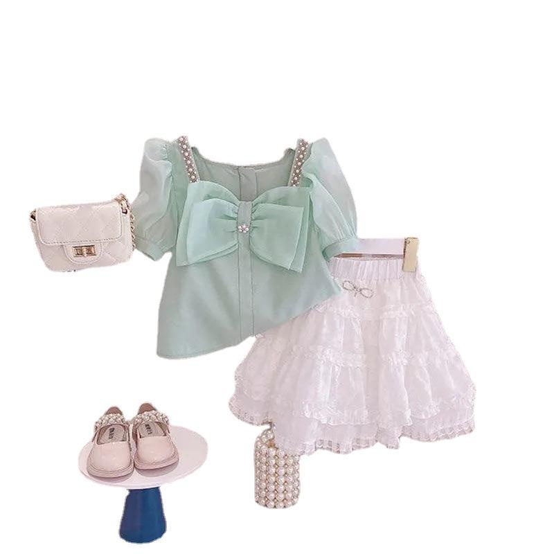 Girls Suit Summer Korean Style Short-sleeved Bowknot Stylish Top Children's Skirt Casual Two-piece Suit