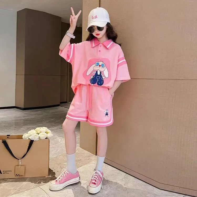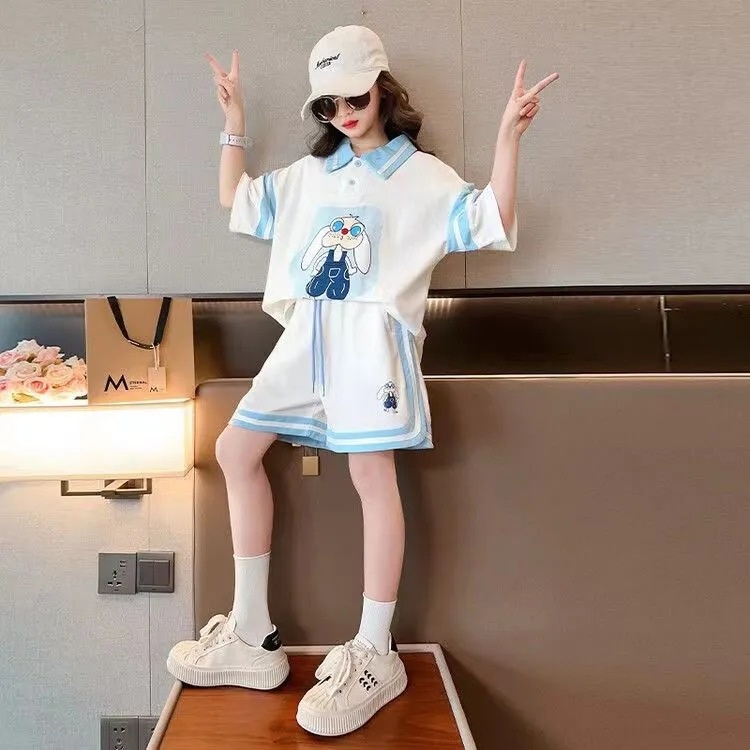 Children's Clothing Girls Short-sleeved Suit Summer Children's Summer Stylish Polo Shirt Half-sleeved T-shirt Two-piece Suit