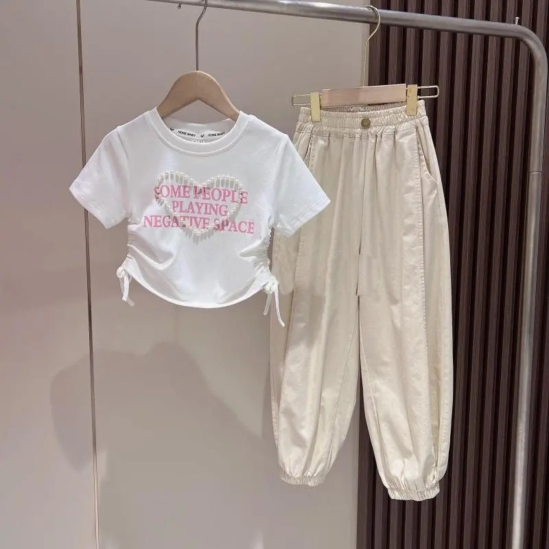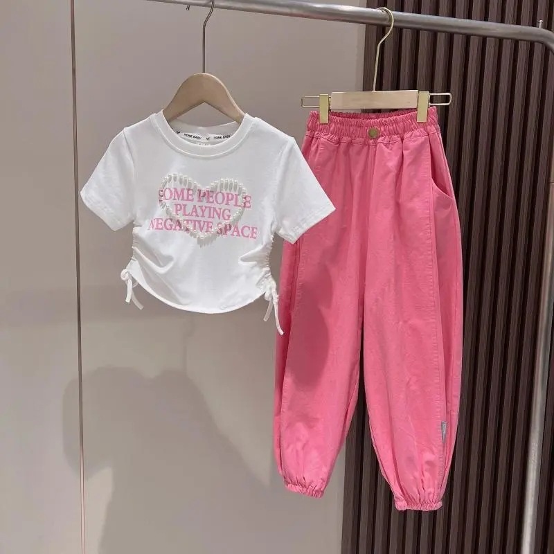 Girls Pearl Waist Short-sleeved Overalls Suit Summer Style Fashionable And Stylish Bloomers Two-piece Suit For Middle And Large Children