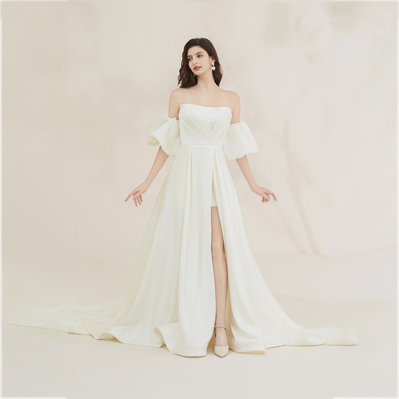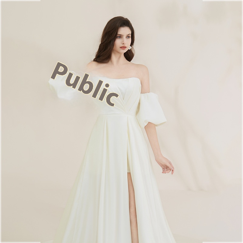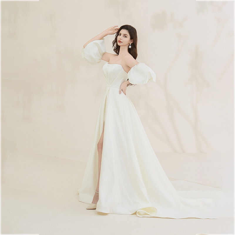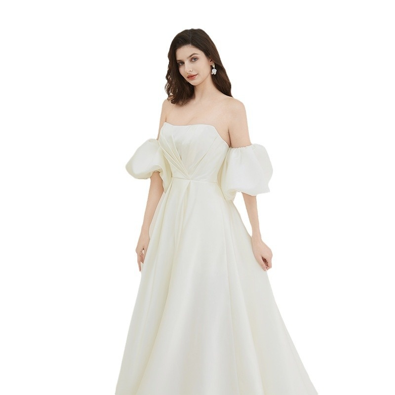 Halter Neck Satin High-end Women's Dress Long Dress Waist Lantern Short-sleeved Light Wedding Dress