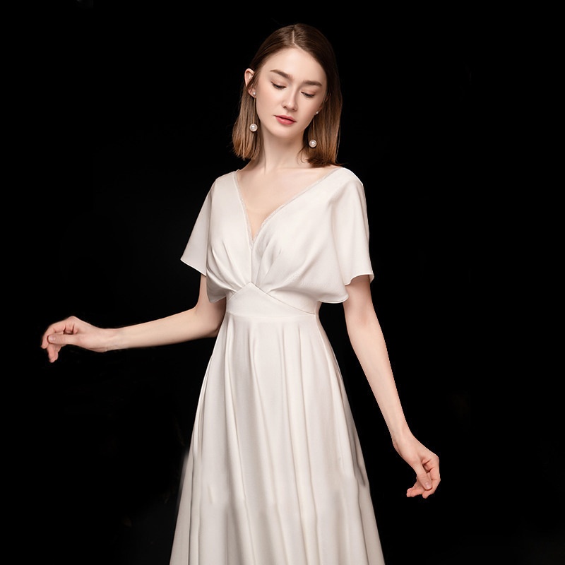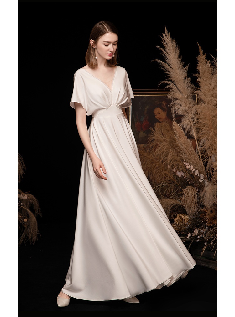 Light Wedding Dress Pure Color Simple Style Female Temperament Satin Wedding Dress Forest Style Slim Cover Arm Banquet Evening Dress