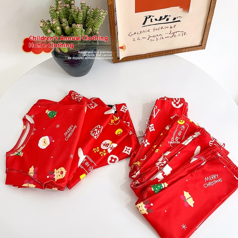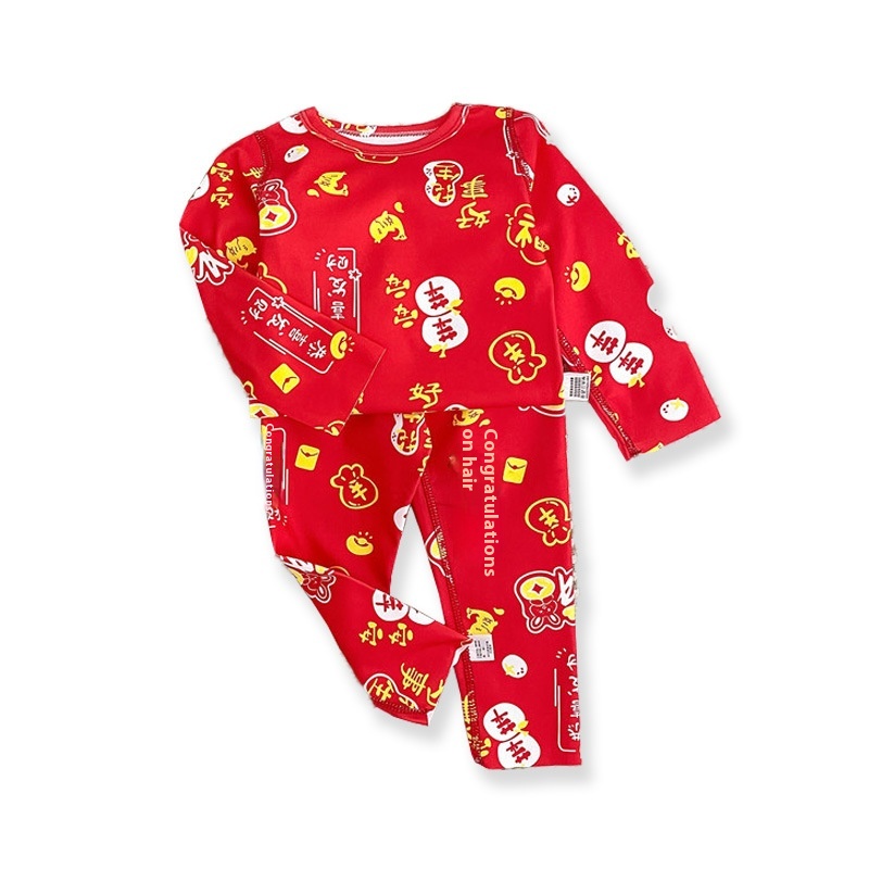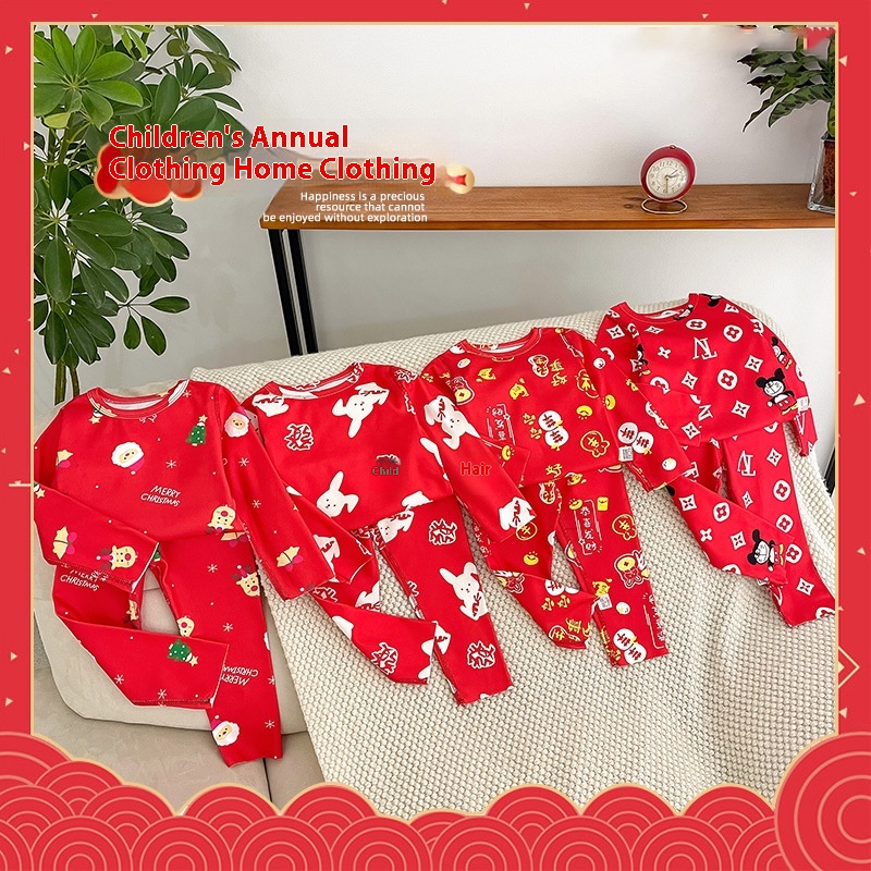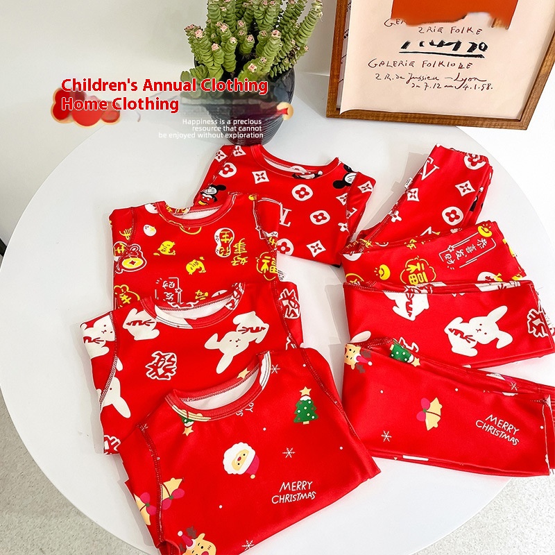 Children's Zodiac Year German Velvet Boneless Home Clothes Set Boys And Girls Seamless Year Greetings Clothes Bright Red Autumn Clothes And Autumn Pants