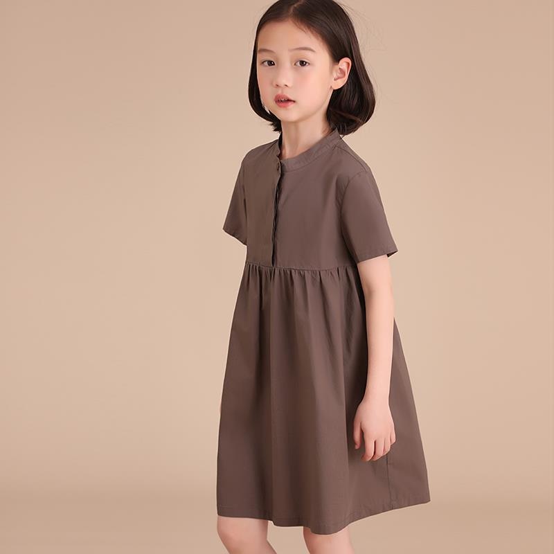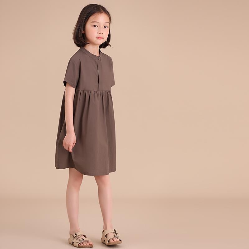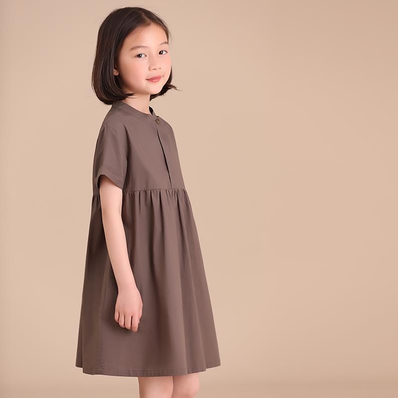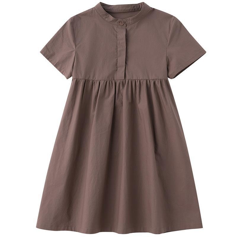 Children's Clothing Summer Dress Girl's Cotton Pleated Japanese Style Buttoned Pleated Solid Color Short-sleeved T-shirt Dress