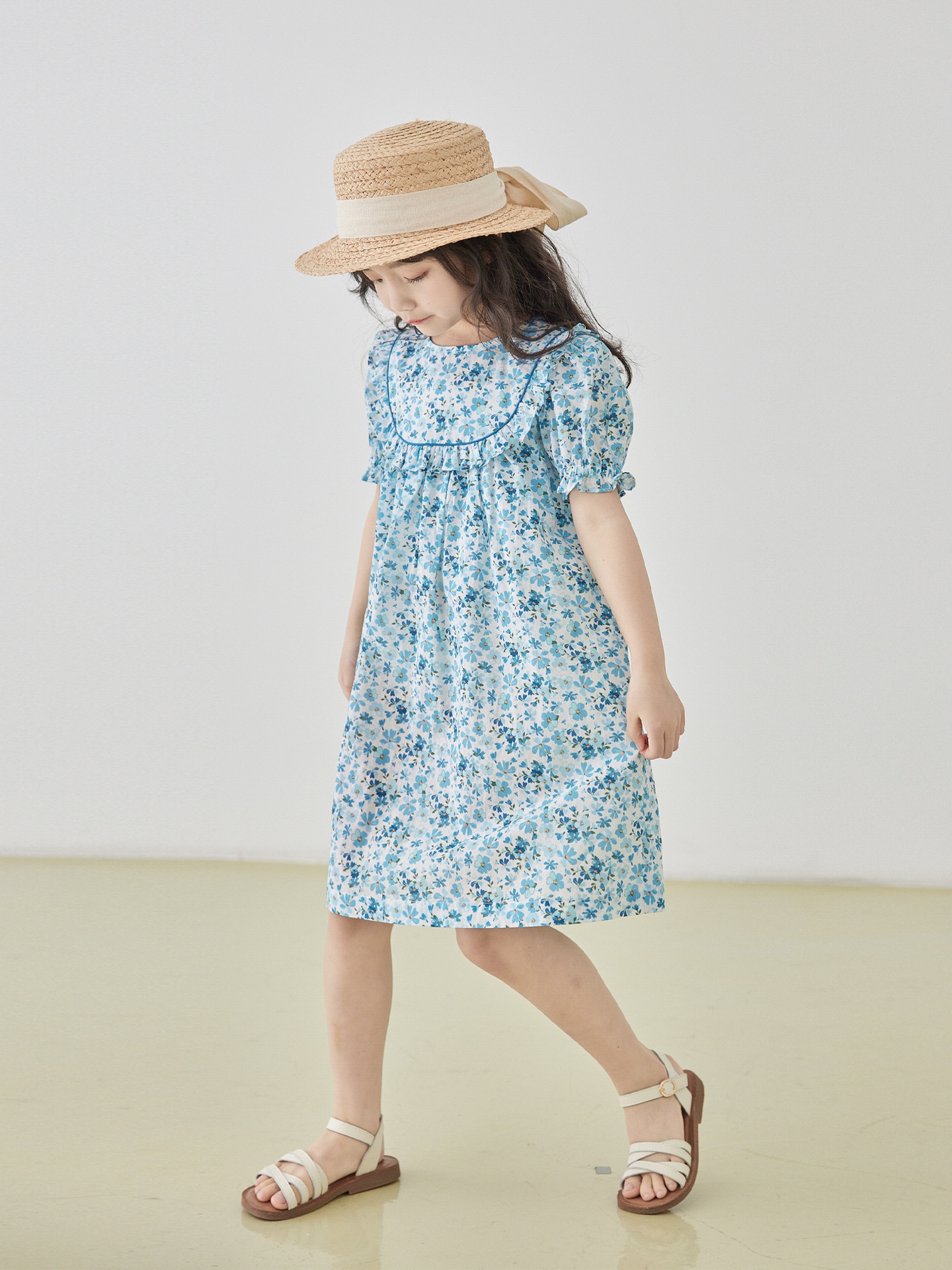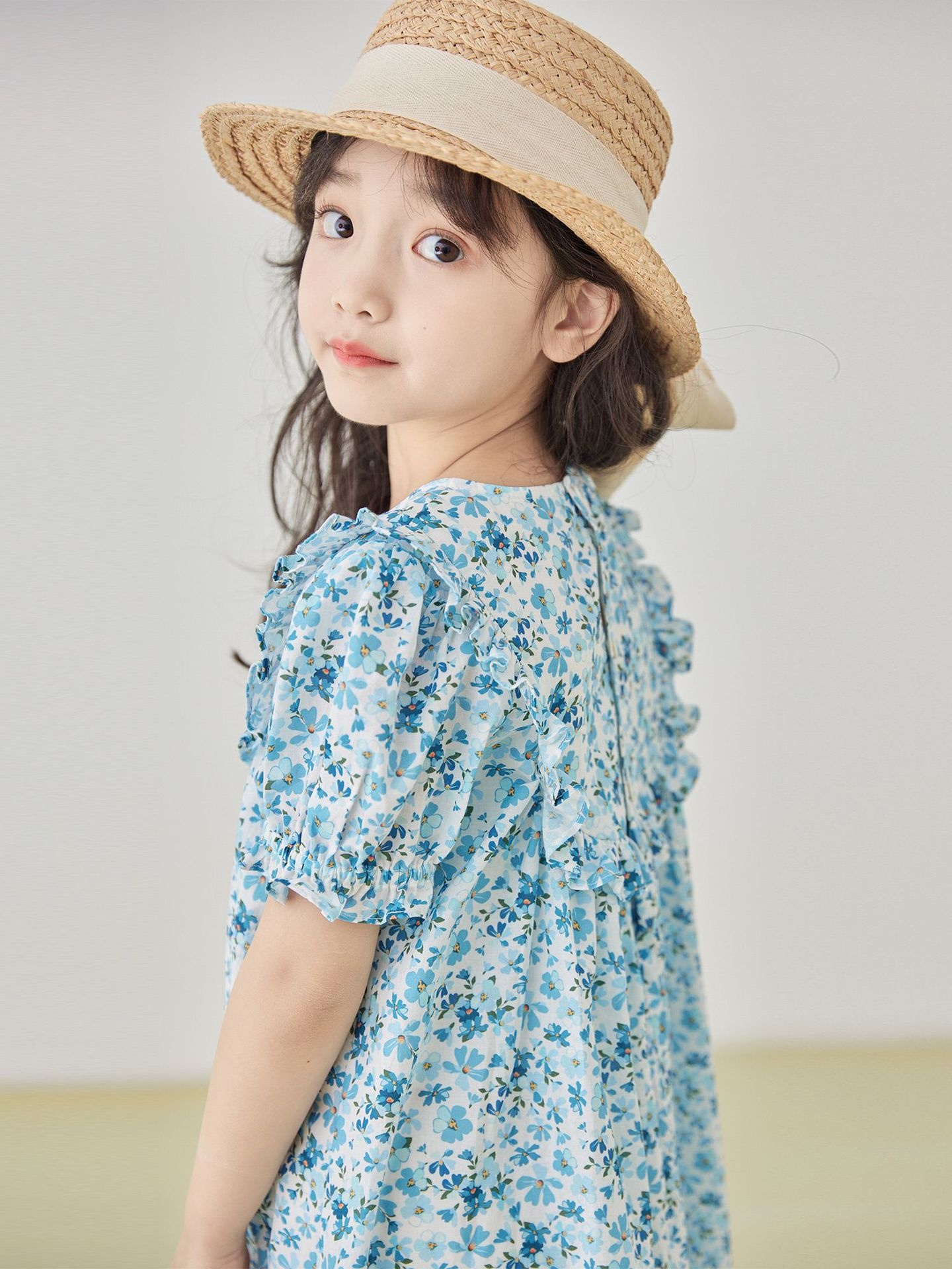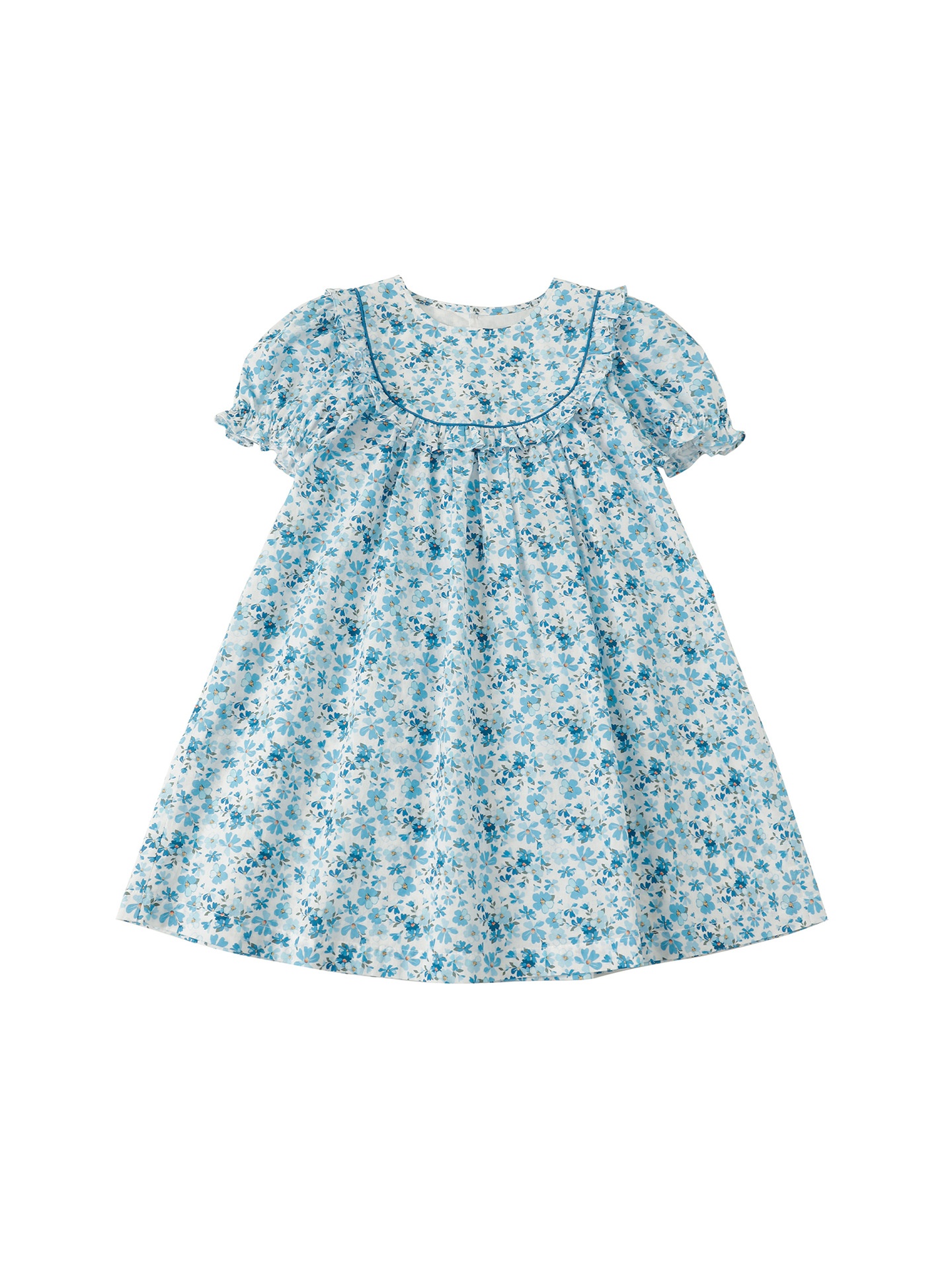 Girls Spring And Summer Blue Floral Dress Korean Round Neck Sweet Flower Sleeve Princess Dress