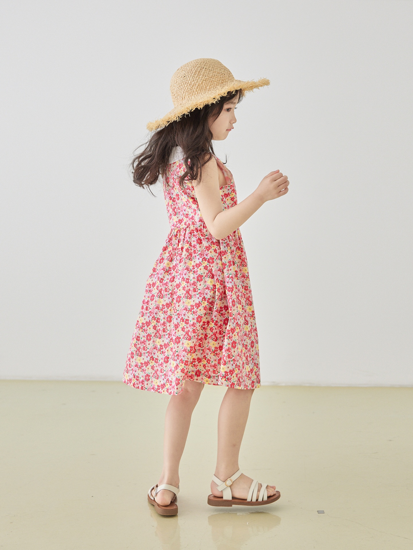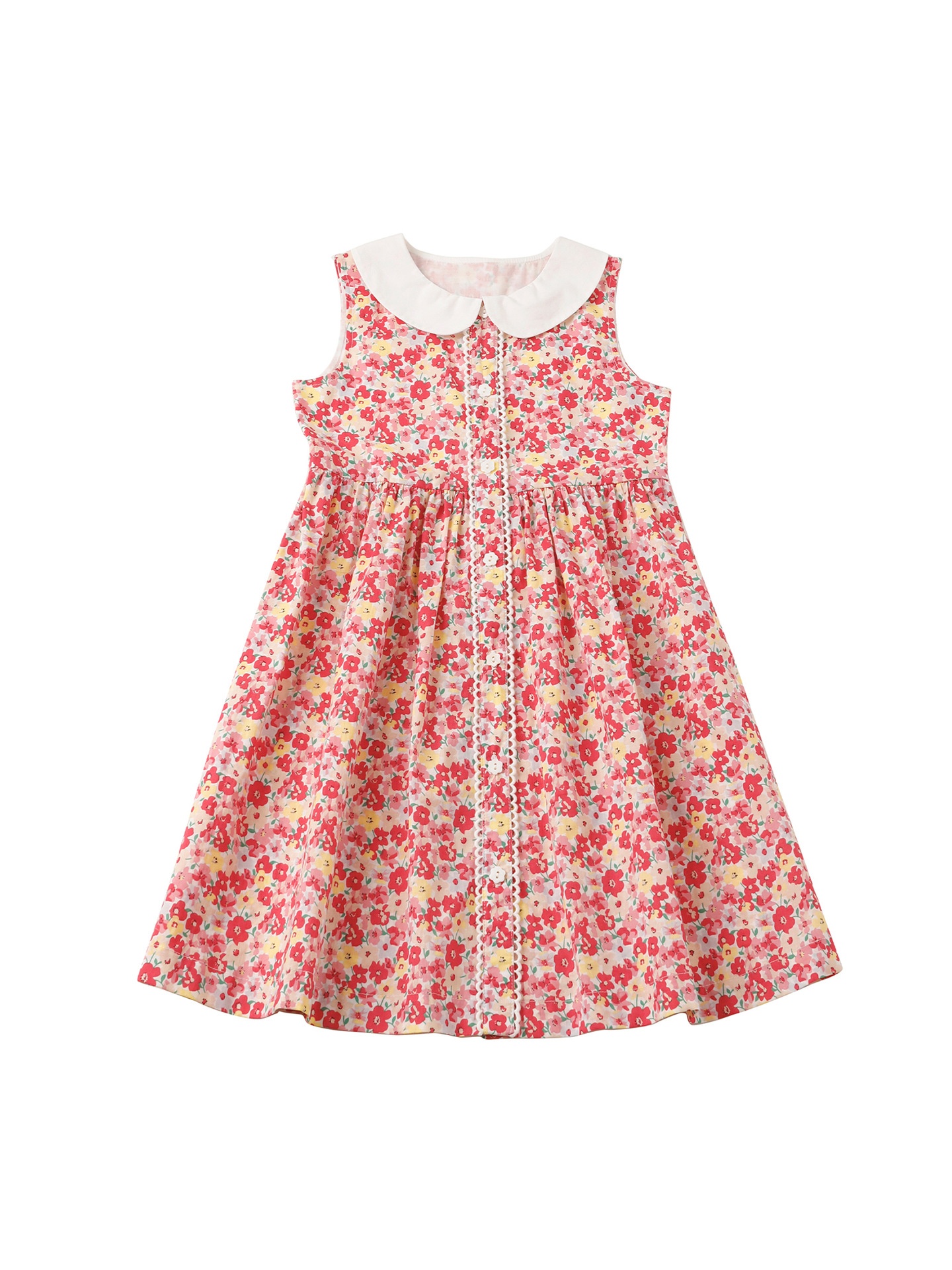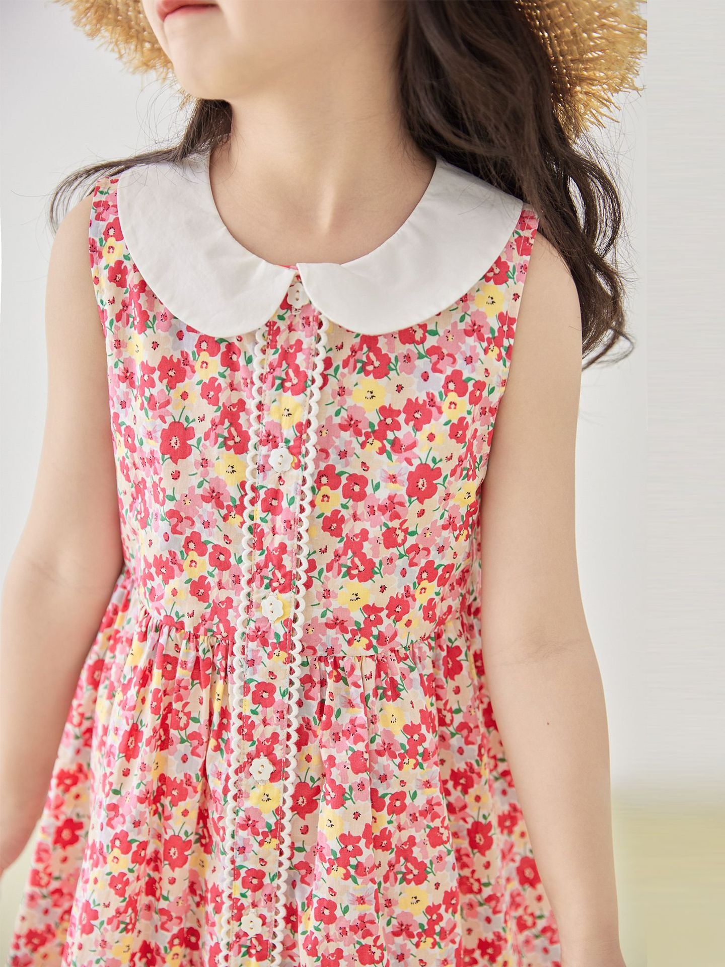 Girls Spring And Summer Red Floral Vest Dress Pure Cotton Sleeveless Lapel Sweet Princess Dress