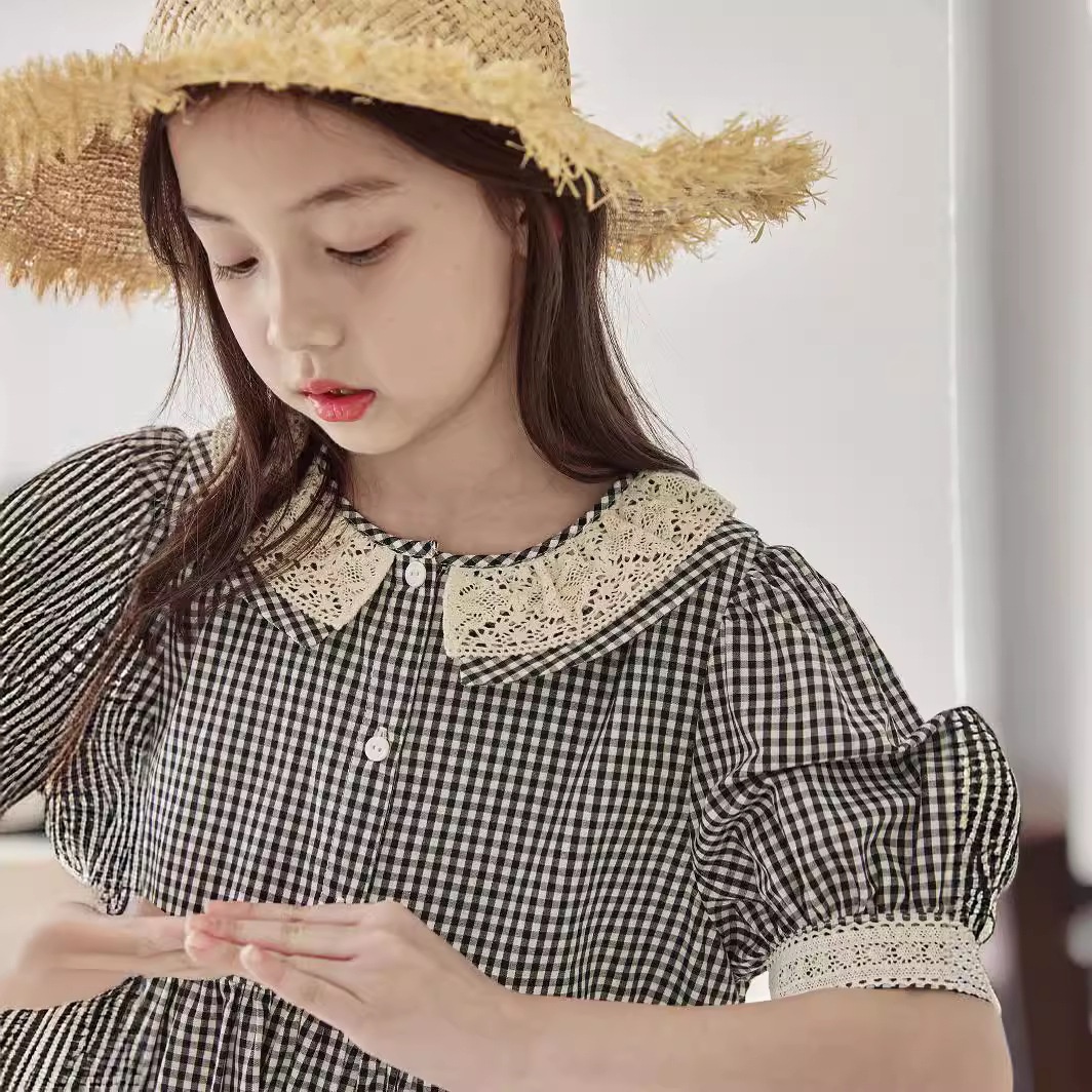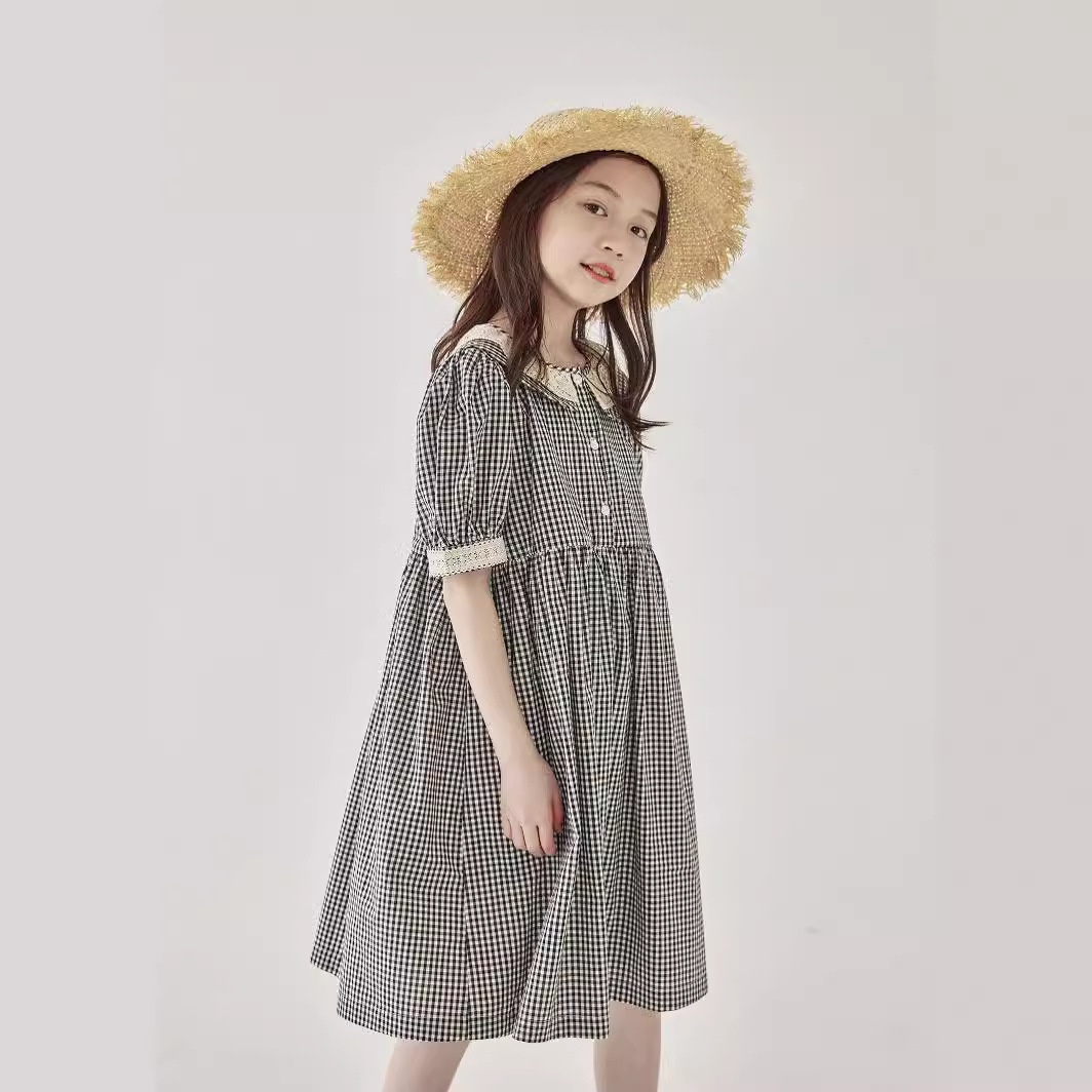 Girls Summer Forest Black And White Checkered Puff Sleeve Dress Children's Literary Splicing Lace Collar Retro Long Skirt