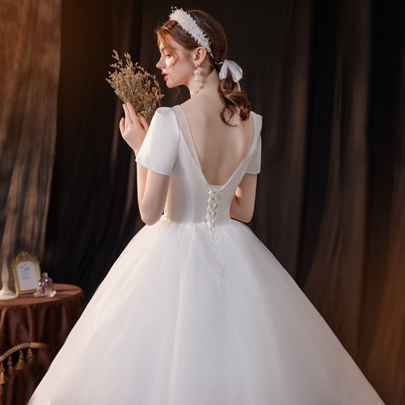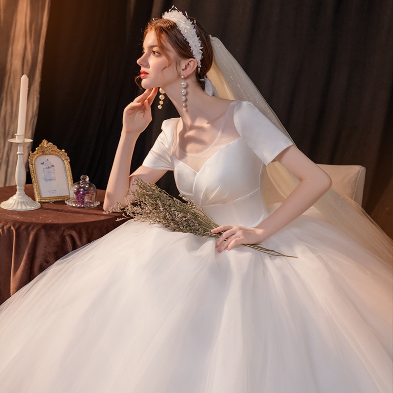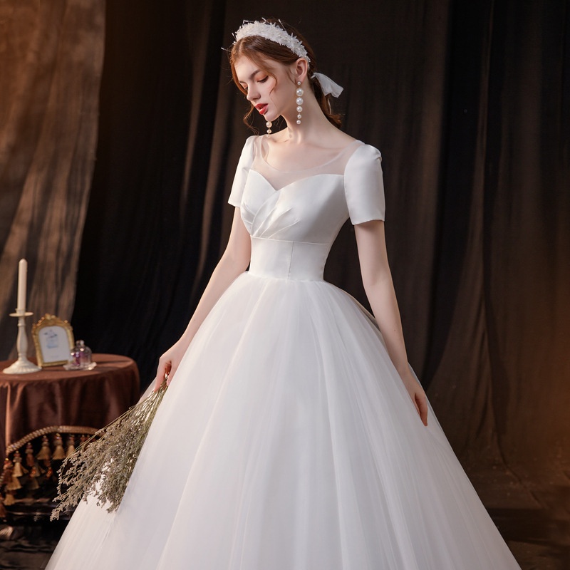 Halter Neck Satin High-end Women's Dress Short-sleeved Waist Wedding Dress Women's Skirt Light Wedding Dress