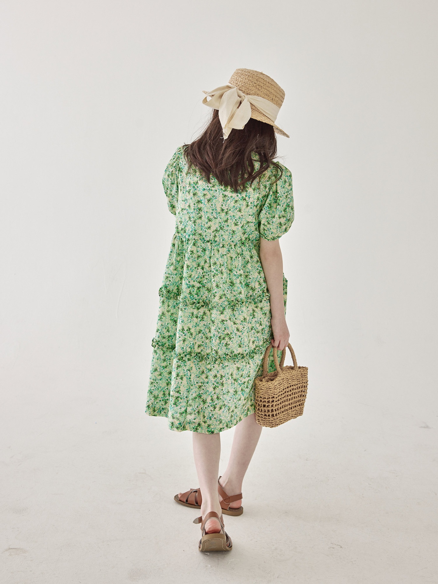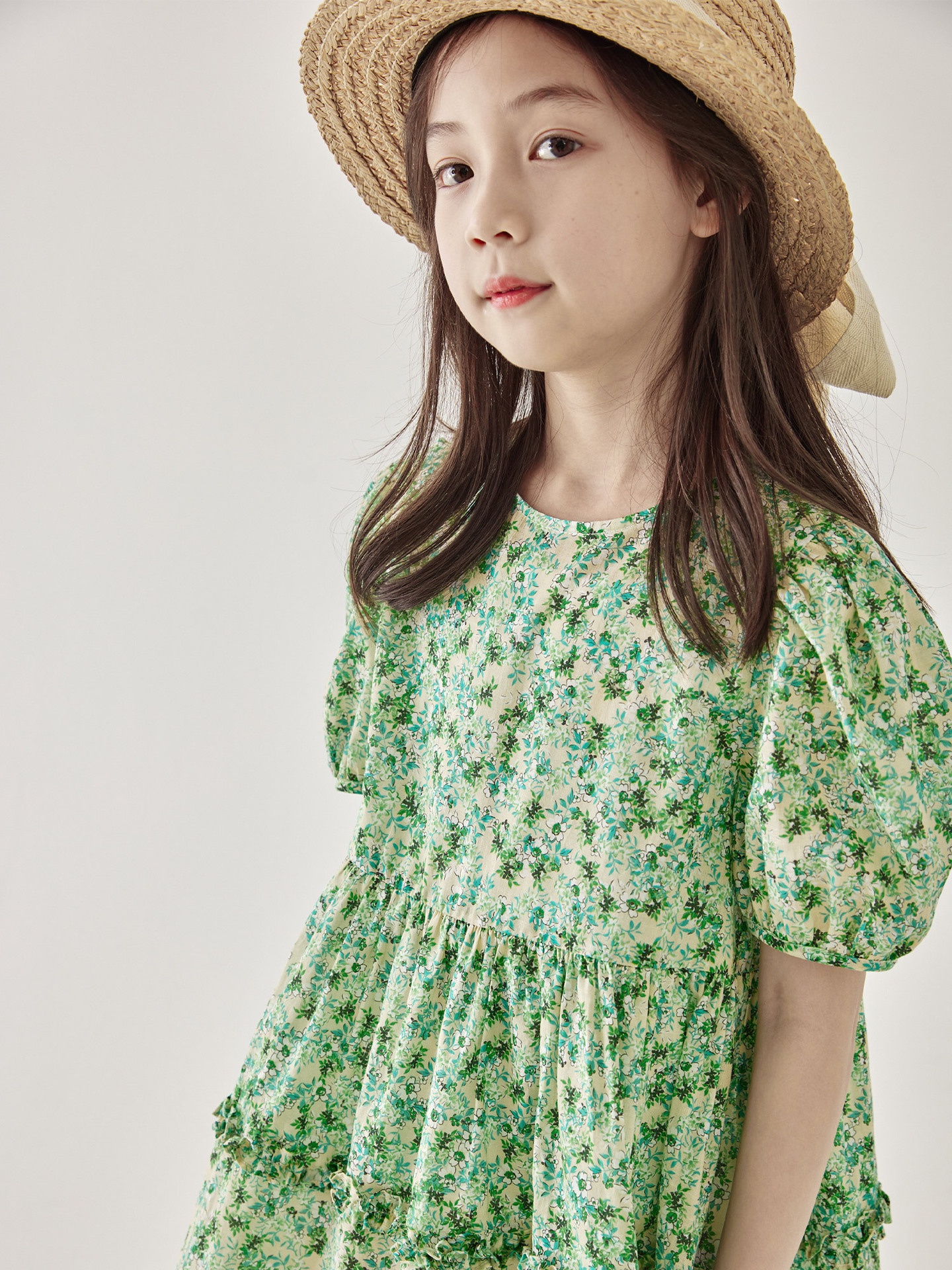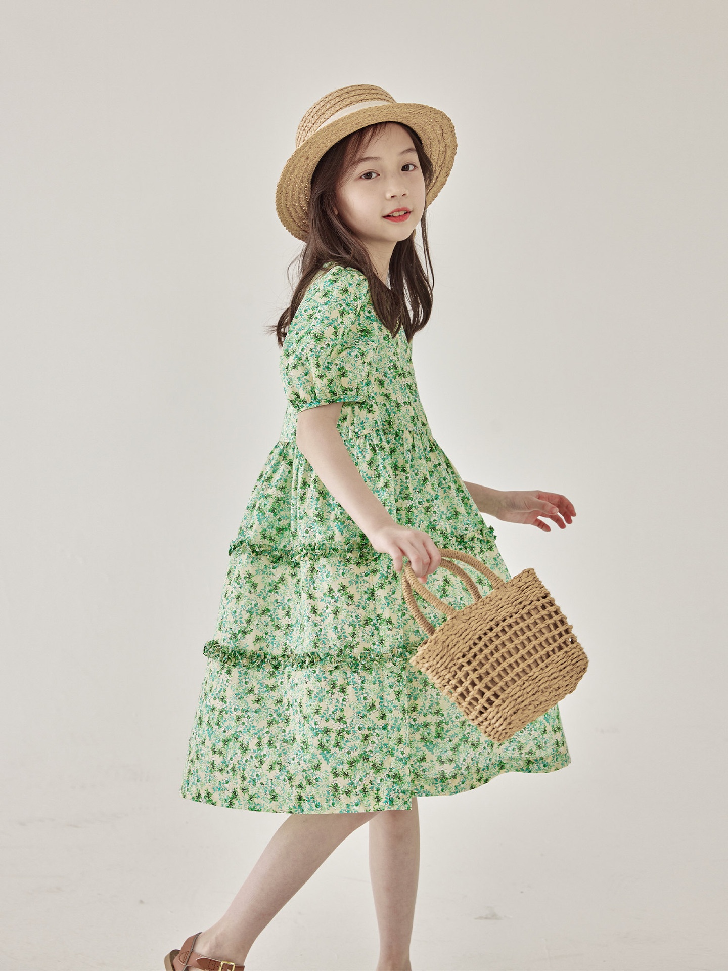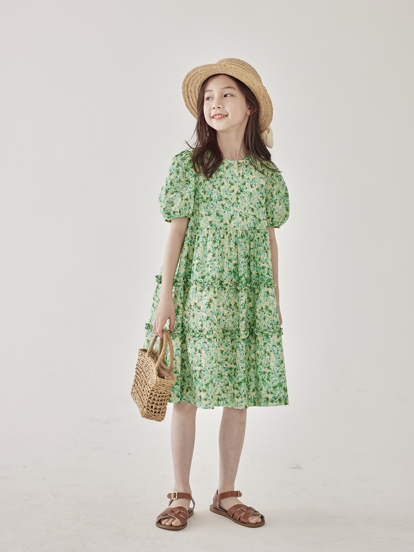 Girls Summer Japanese Green Floral Dress Children's Puff Sleeve Fungus Lace Retro Princess Dress