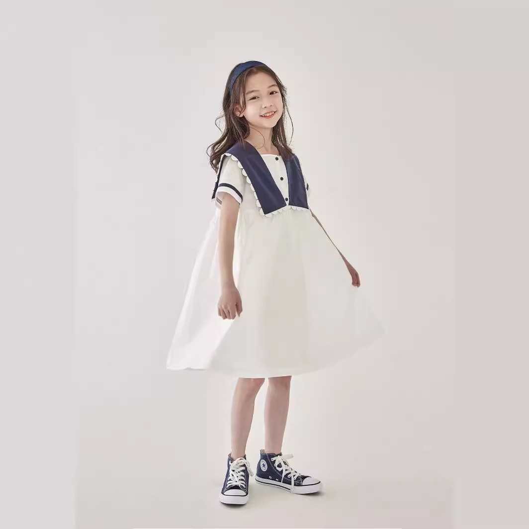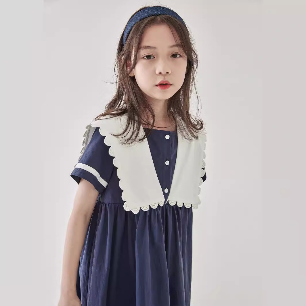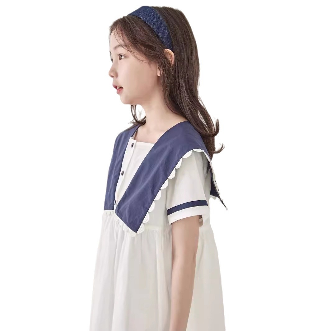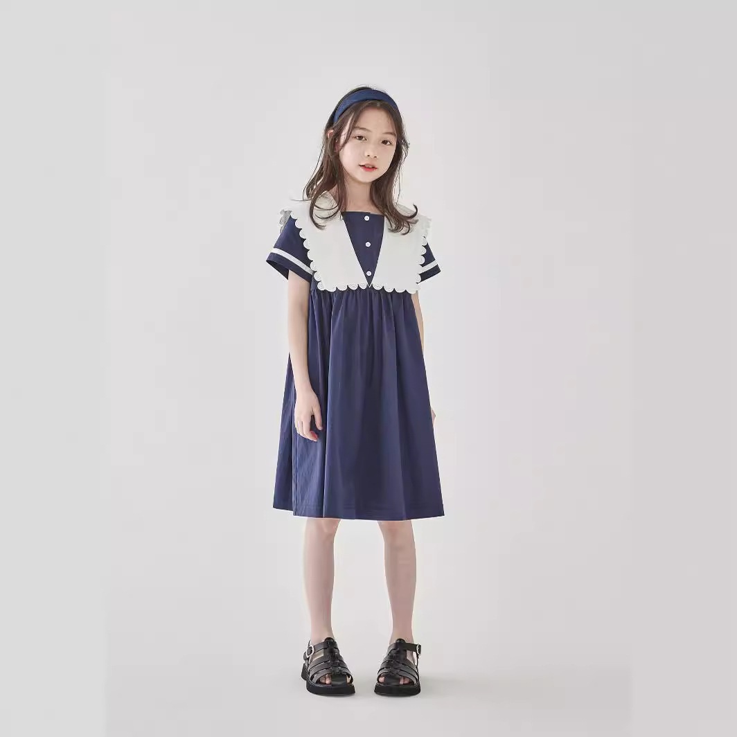Children's Clothing Summer Girls Navy Lace Collar Dress Children's Classic Contrast Color College Style Long Skirt