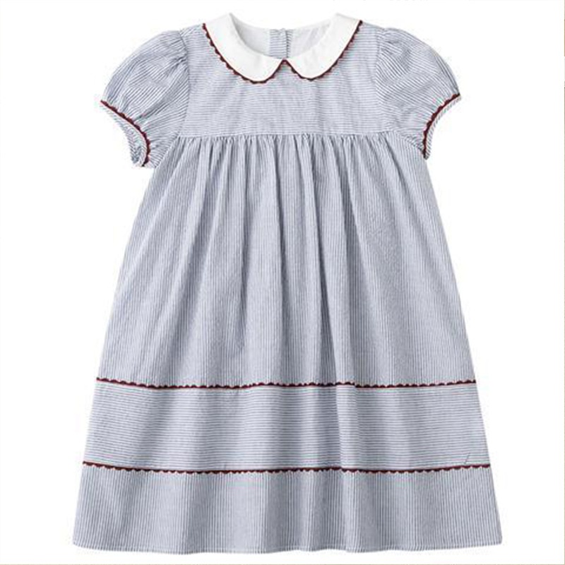 Children's Clothing Summer Arrival Girls Contrast Color Striped Doll Collar Splicing Puff Sleeve A-line Dress