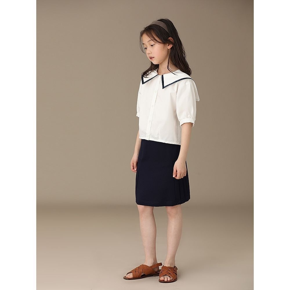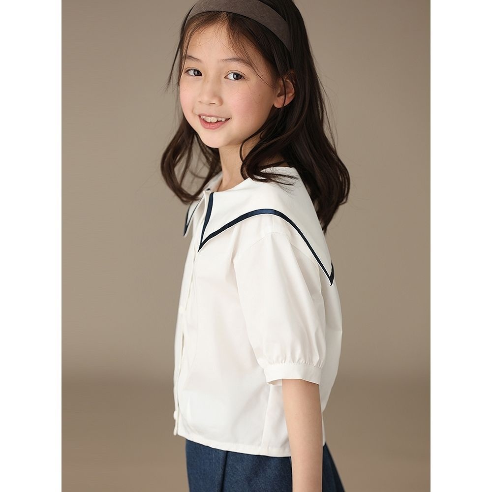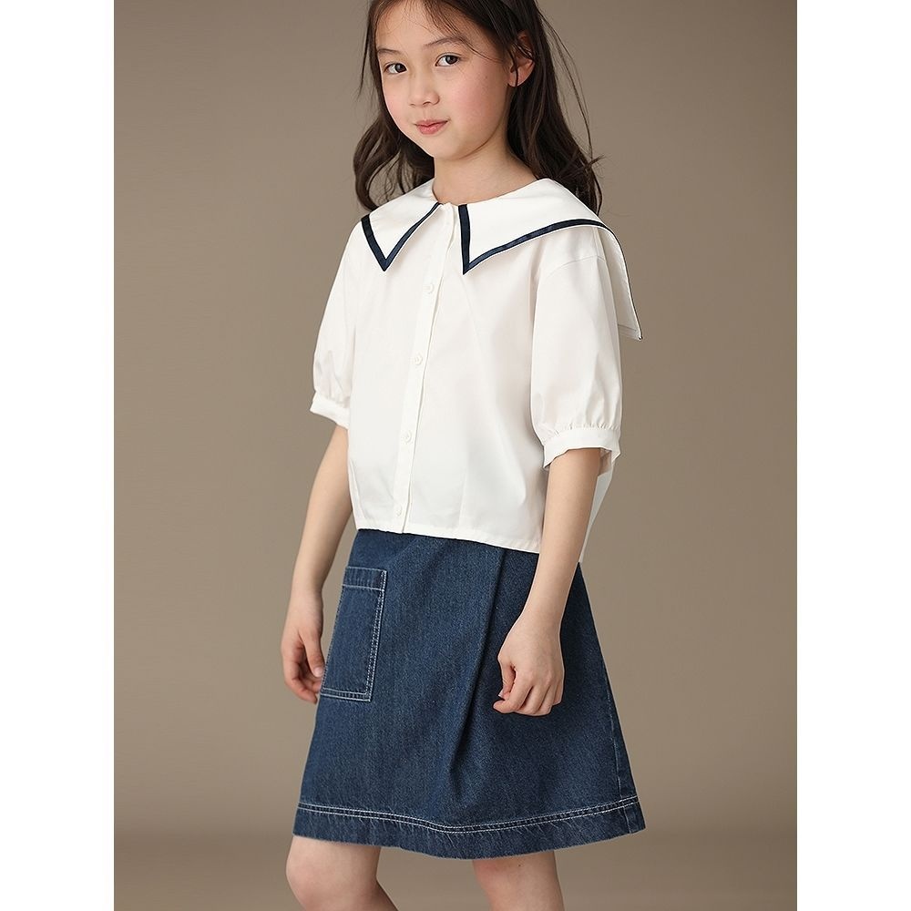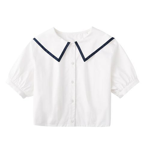 Children's Clothing Summer Girls Navy Collar White Pure Cotton Short-sleeved Button-down Shirt College Style Shirt Temperament
