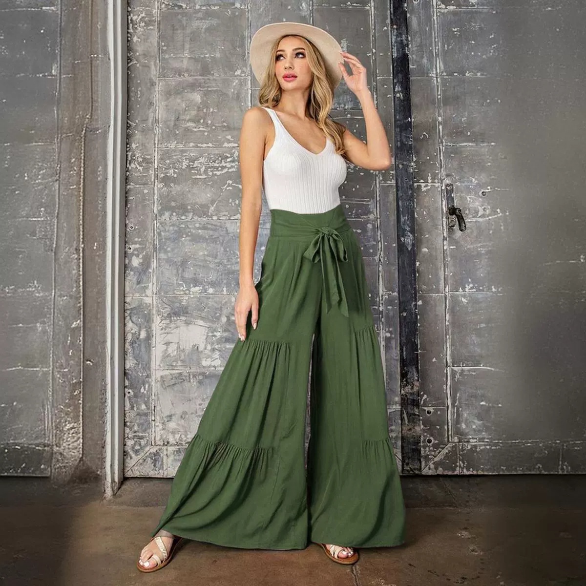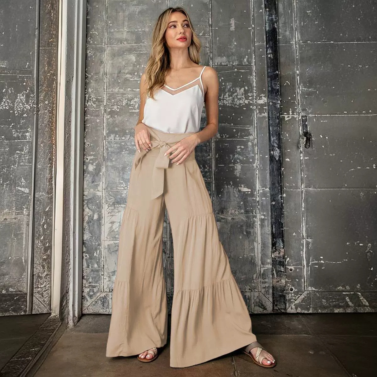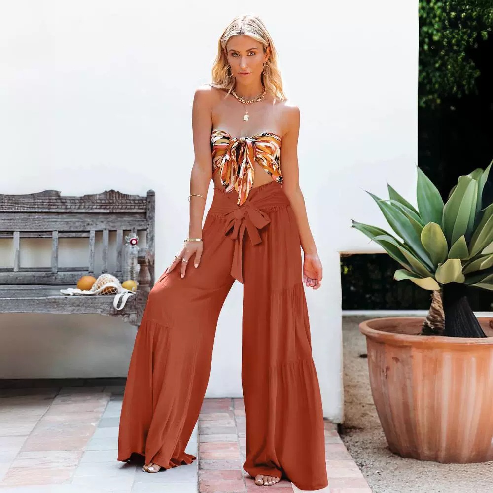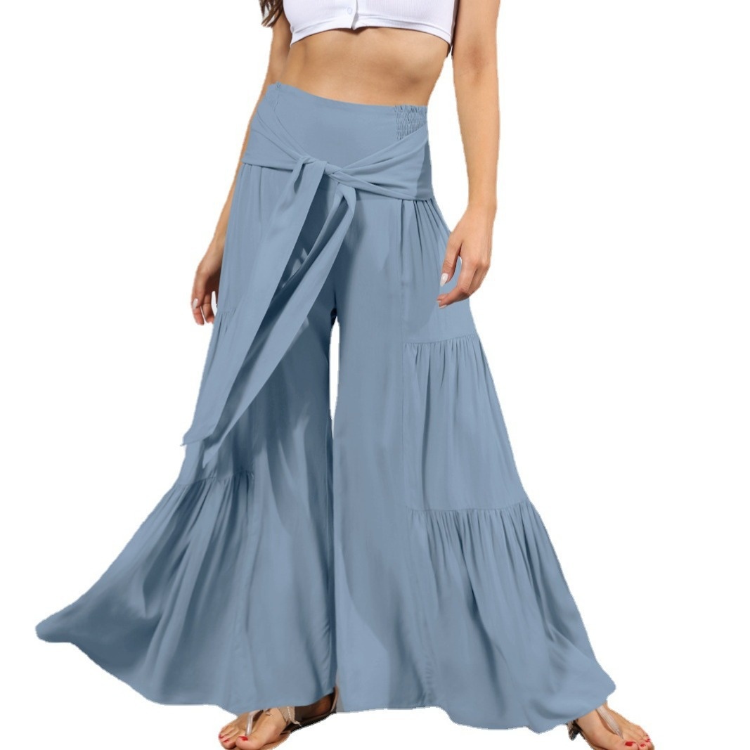 Products European And American Women's Fashion Temperament Tie Elastic Waist Pleated Wide Leg Pants Casual Loose Trousers