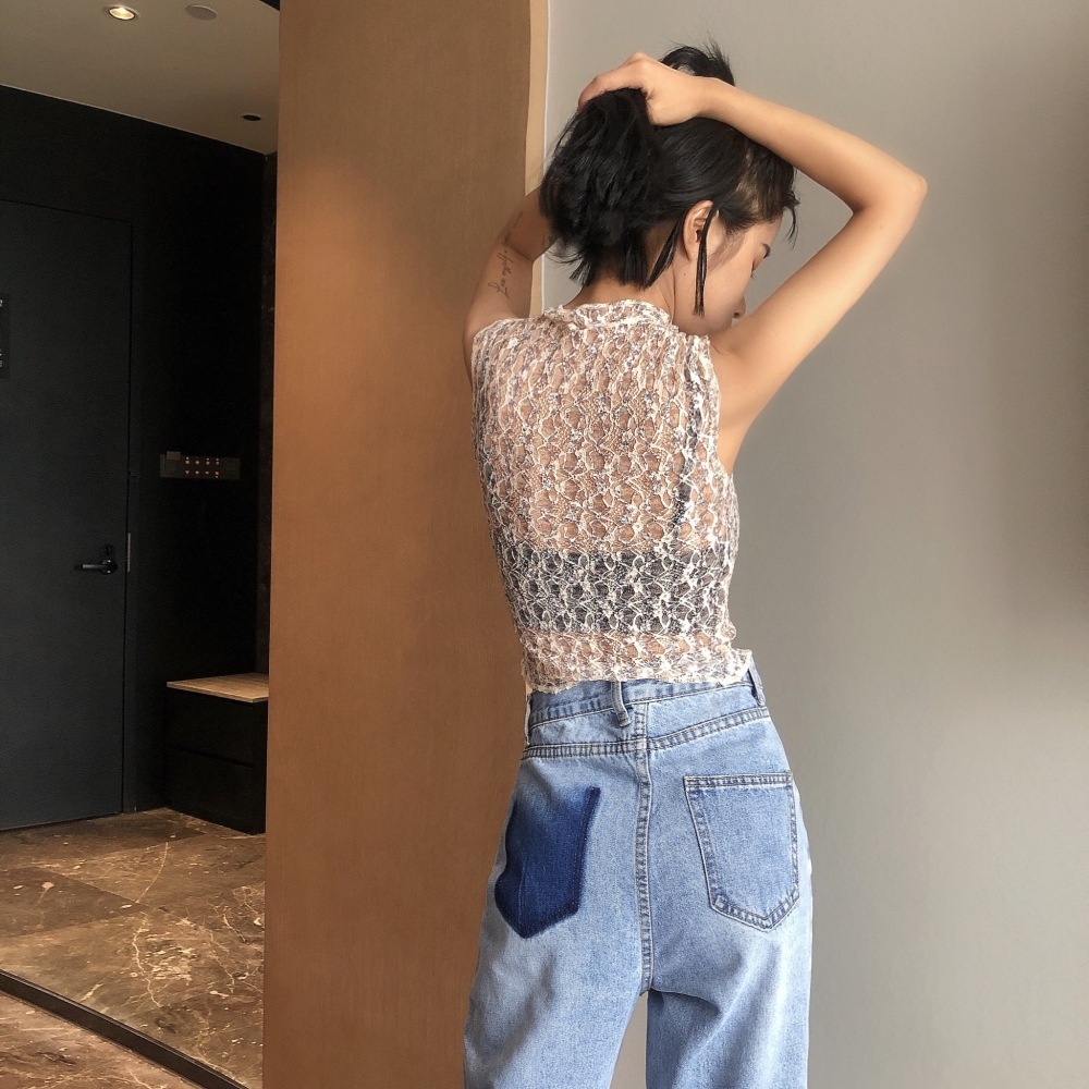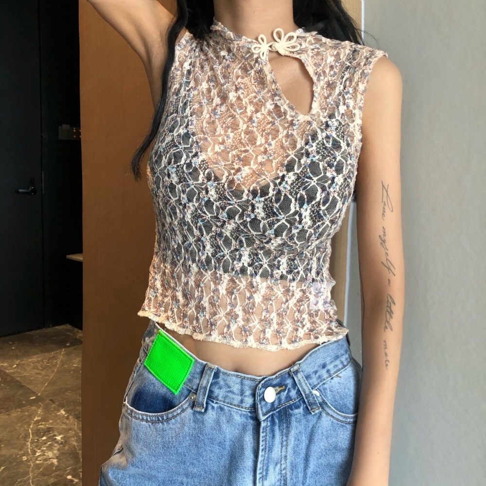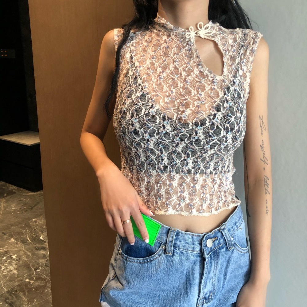 Summer Blogger Tops Female Design Short Sexy Perspective Hollow Lace Shirt