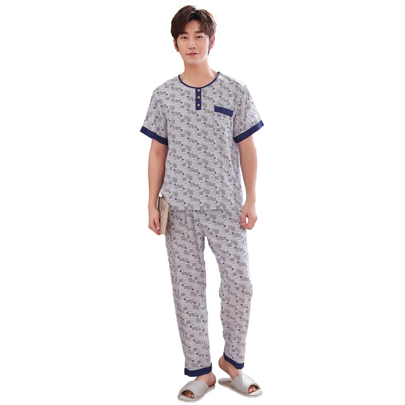 Artificial Cotton Men's Pajamas Spring And Summer Short-sleeved Trousers Suit Cotton Silk Home Clothes Dad's Clothes One Piece Dery