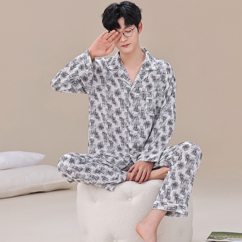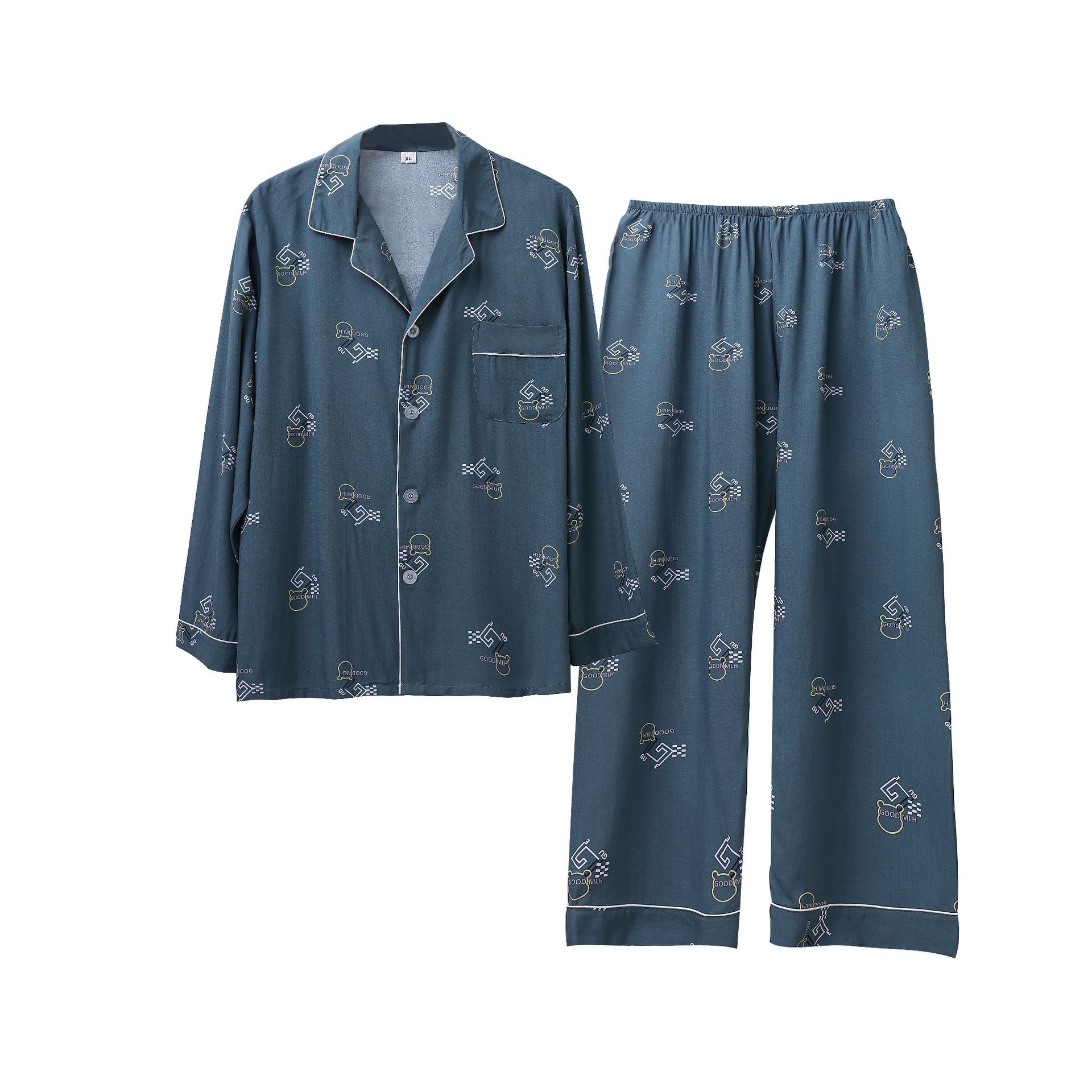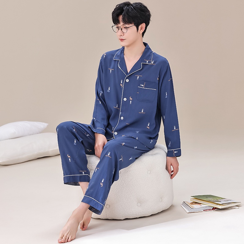 Artificial Cotton Men's Pajamas Spring And Summer Long-sleeved Trousers Suit Cotton Silk Home Clothes Casual Cardigan Pajamas