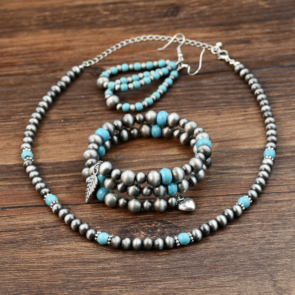 Personalized Retro Western Navajo Pearls Ancient Tin Beaded Necklace Bracelet Drop-Shaped Earrings Set