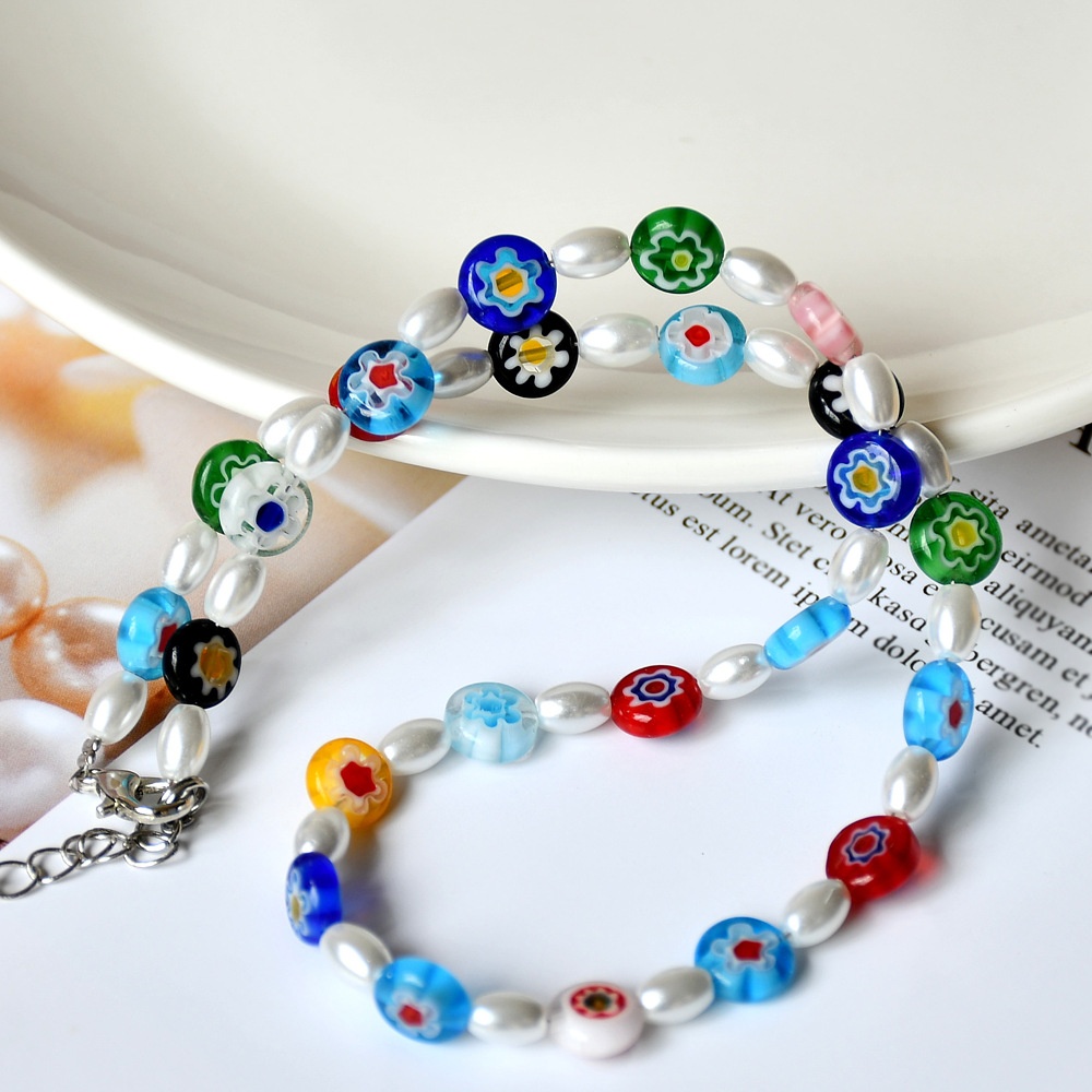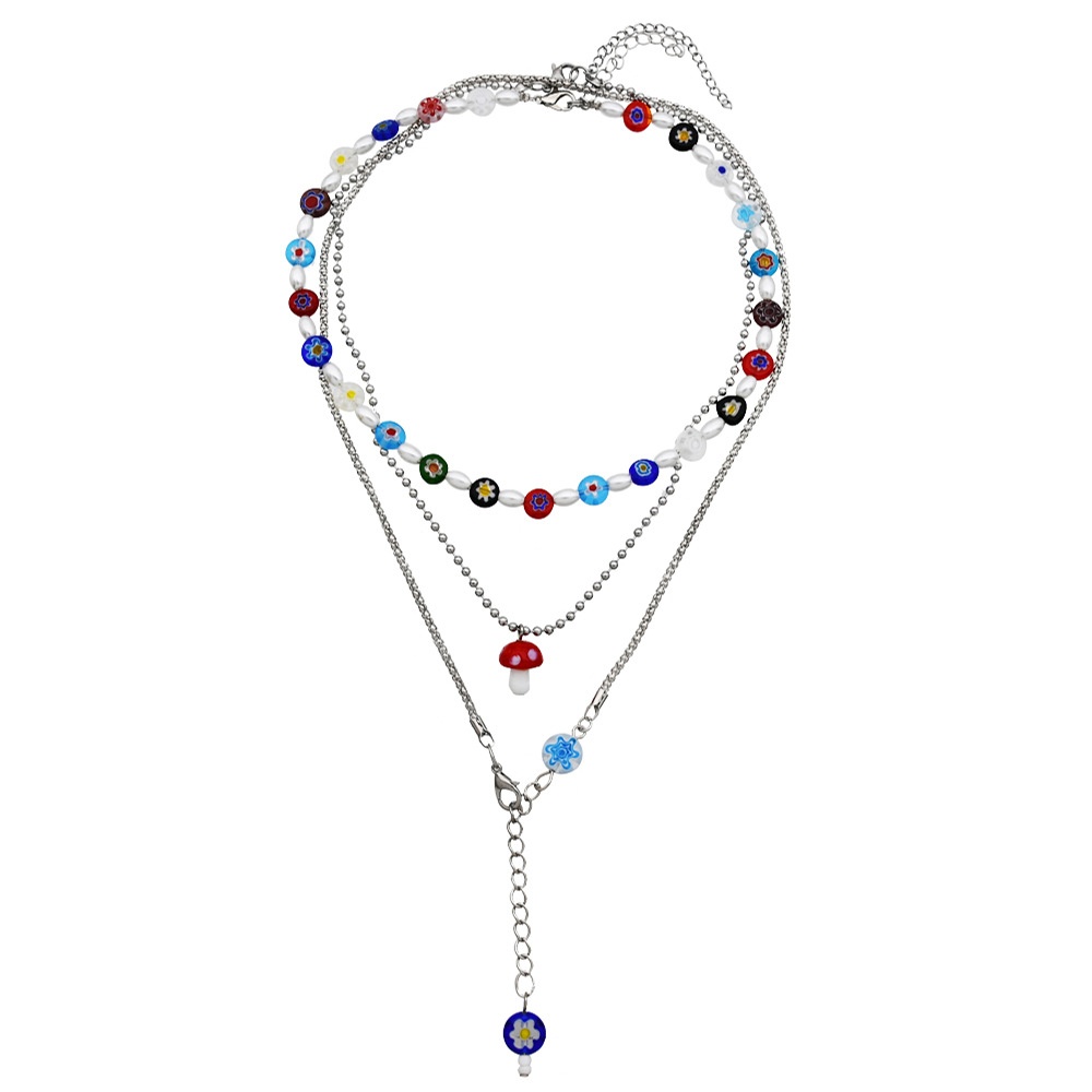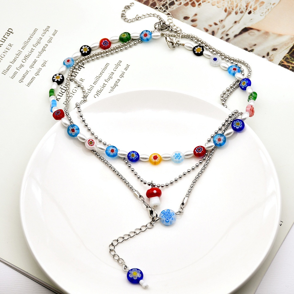 South Korea's Dongdaemun Cold Style Metal Stacked Pearl Niche Color Glass Flower Mushroom Pendant Necklace Female