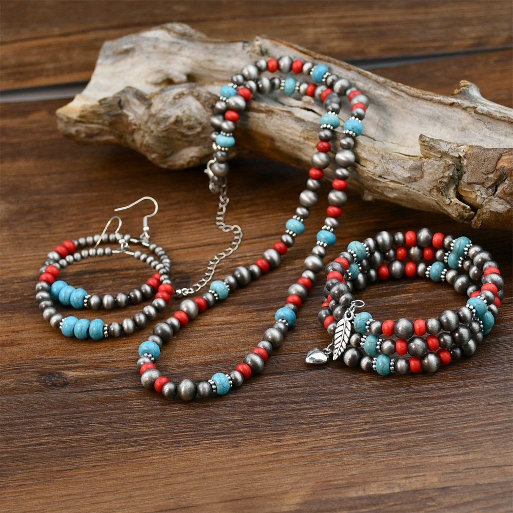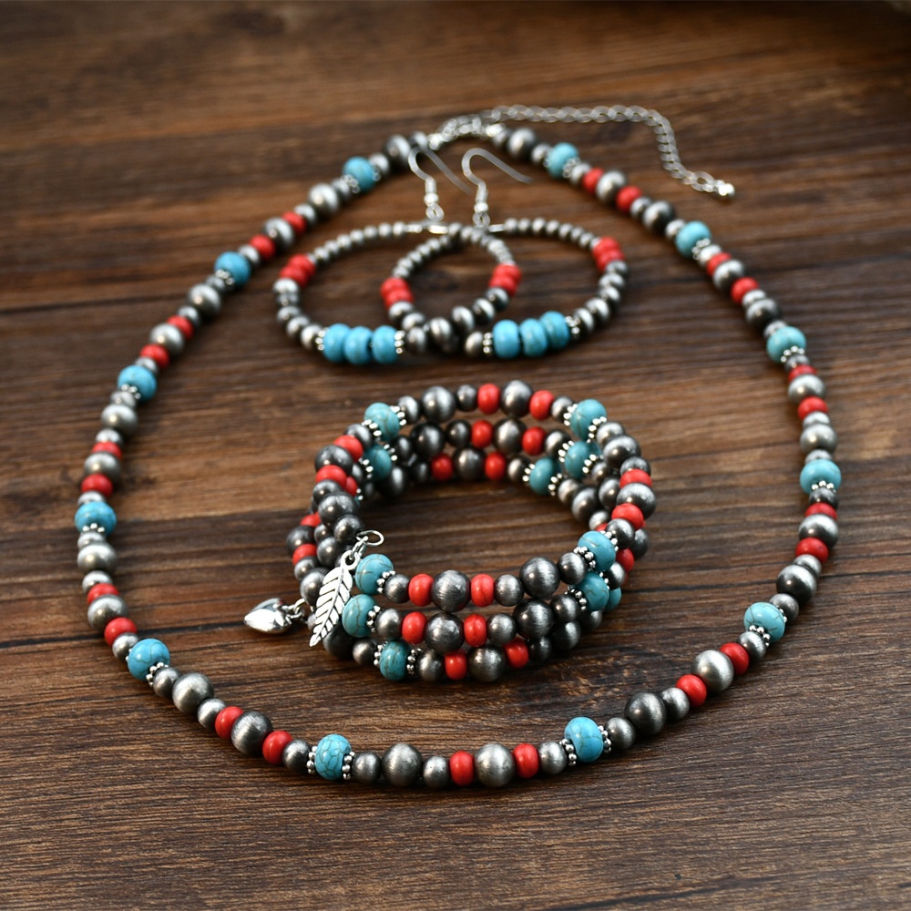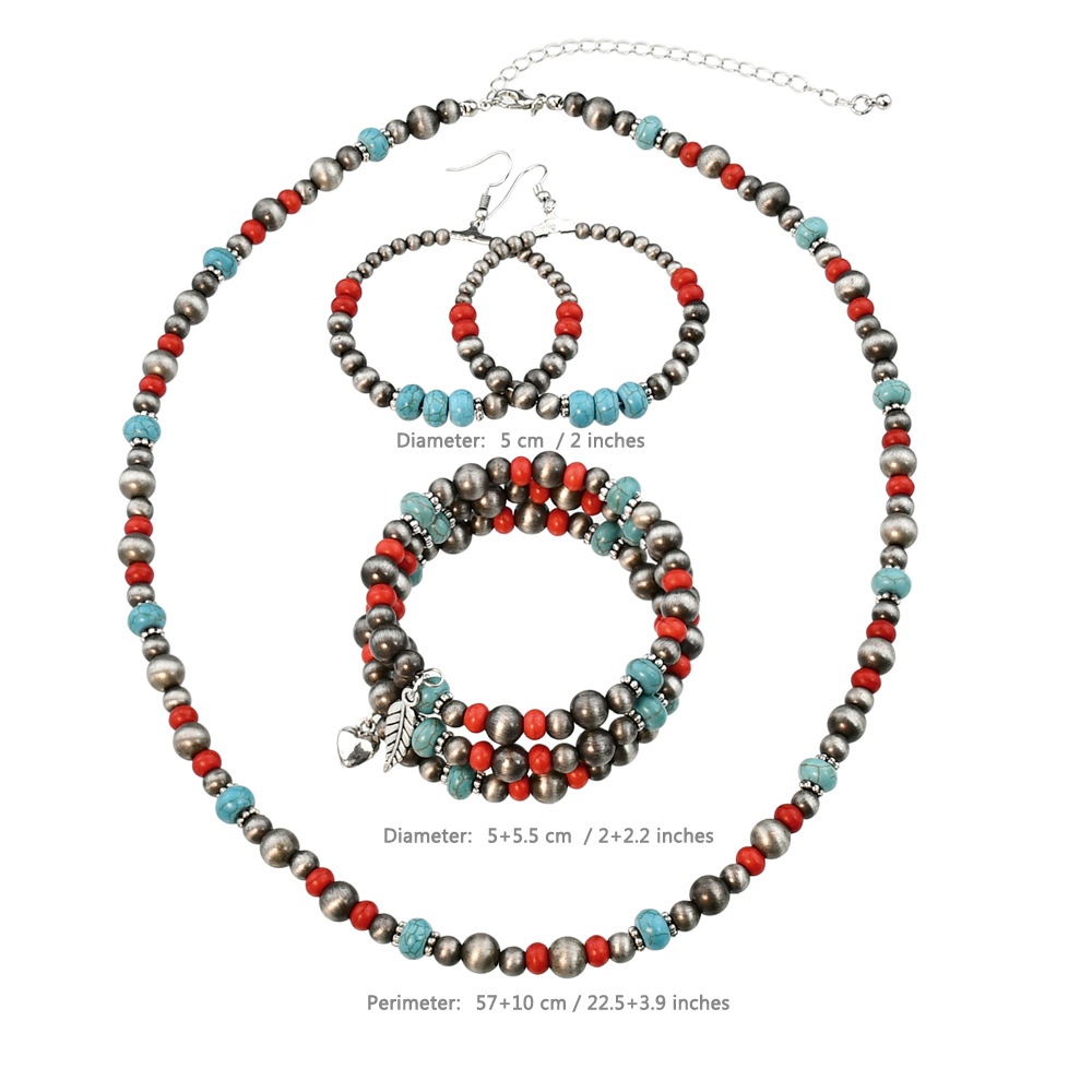 Retro Bohemian Red Turquoise Beaded Jewelry Ethnic Style Ancient Tin Necklace Earrings Bracelet Three-piece Set