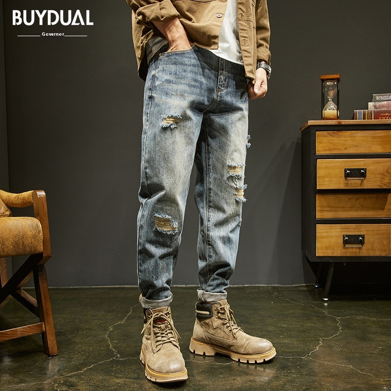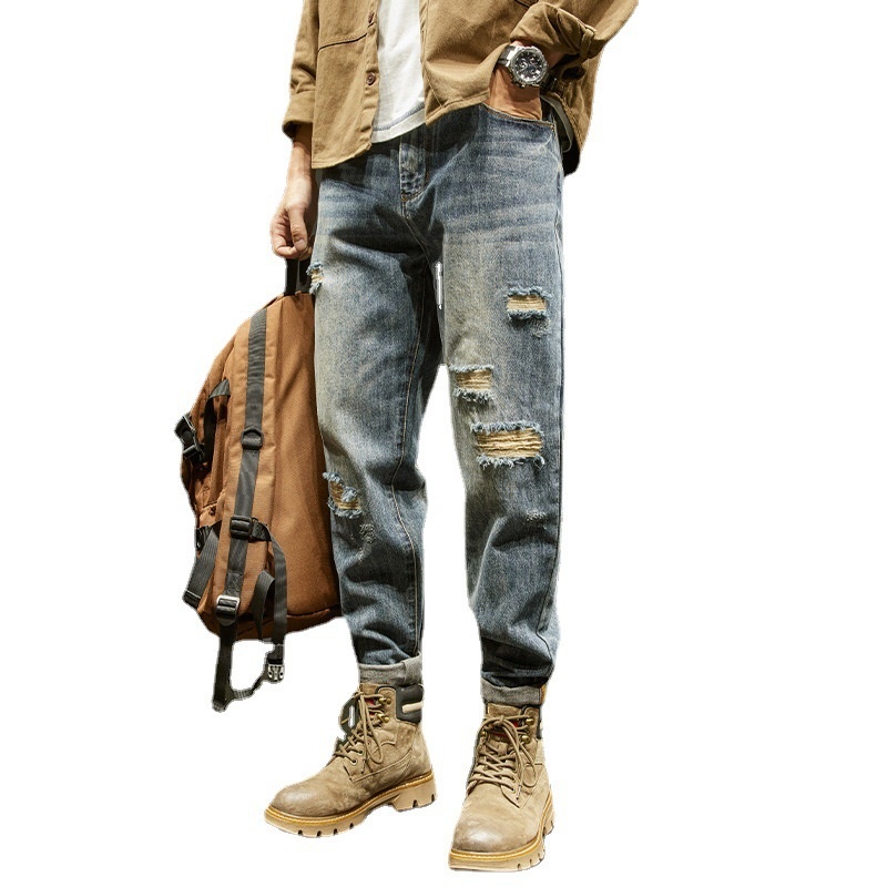 Pants Men Loose Autumn Ripped Patch Jeans Men Tapered Retro High Street American Style Large Size High-end Harem Pants
