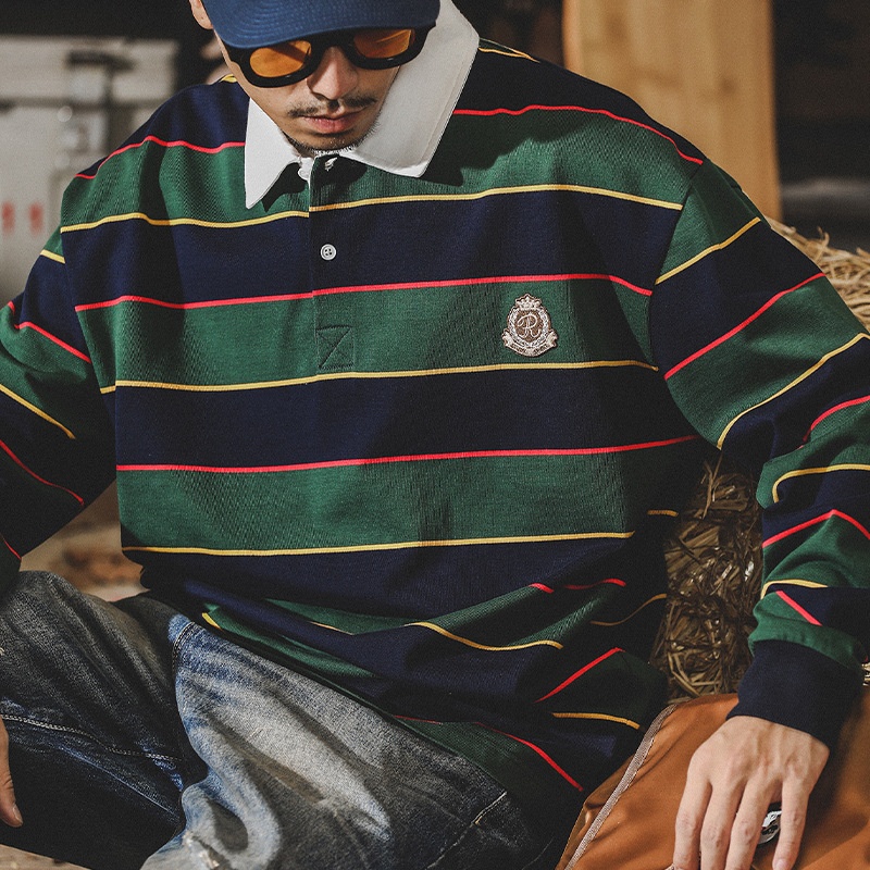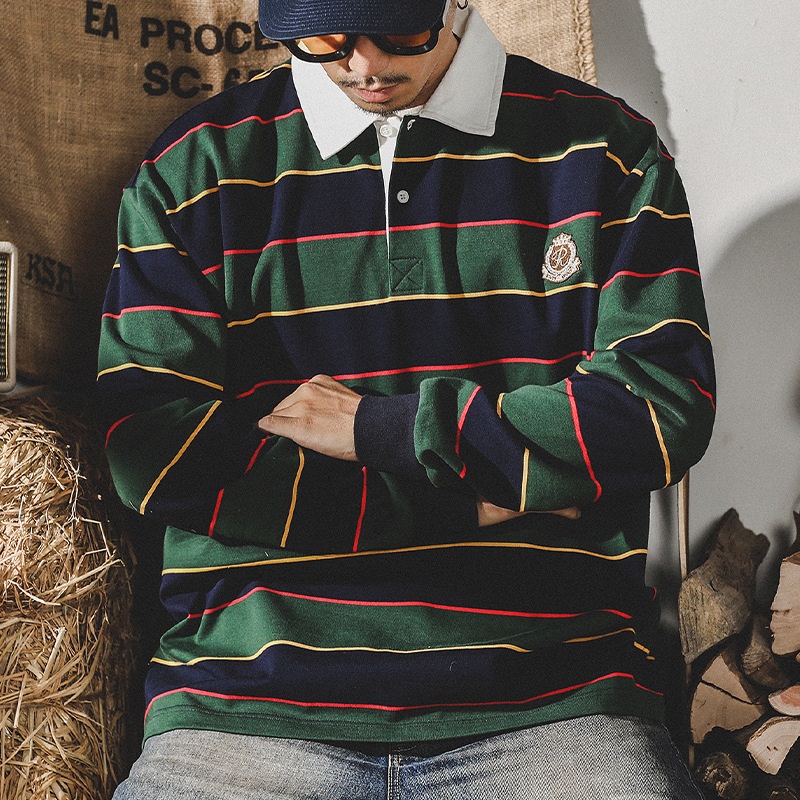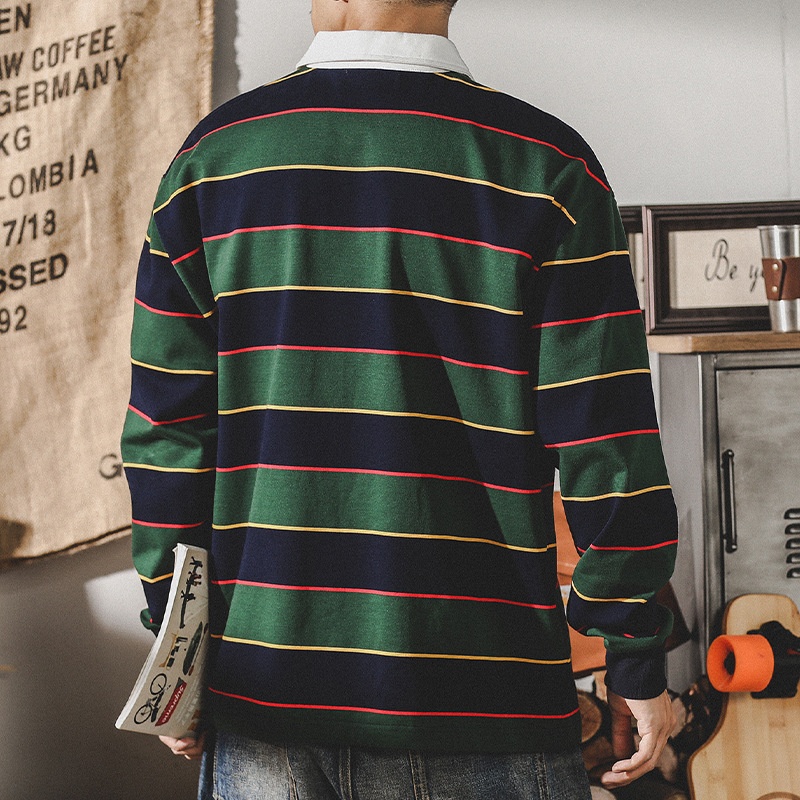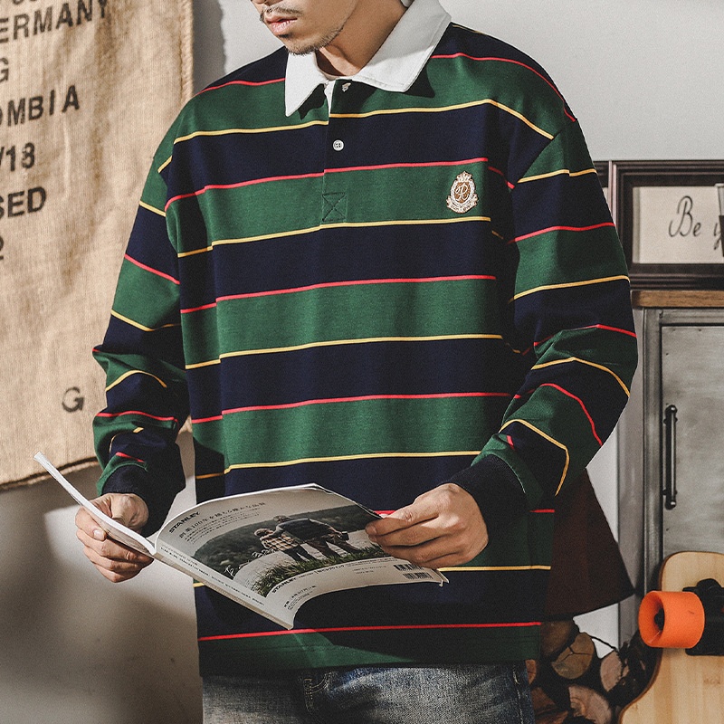 American Style320g Heavyweight T-shirt Men's Long Sleeve Men's Autumn Scottish Striped Ivy POLOShirt Rugby Shirt