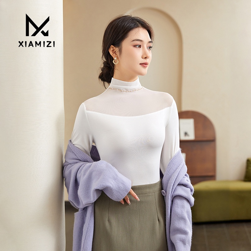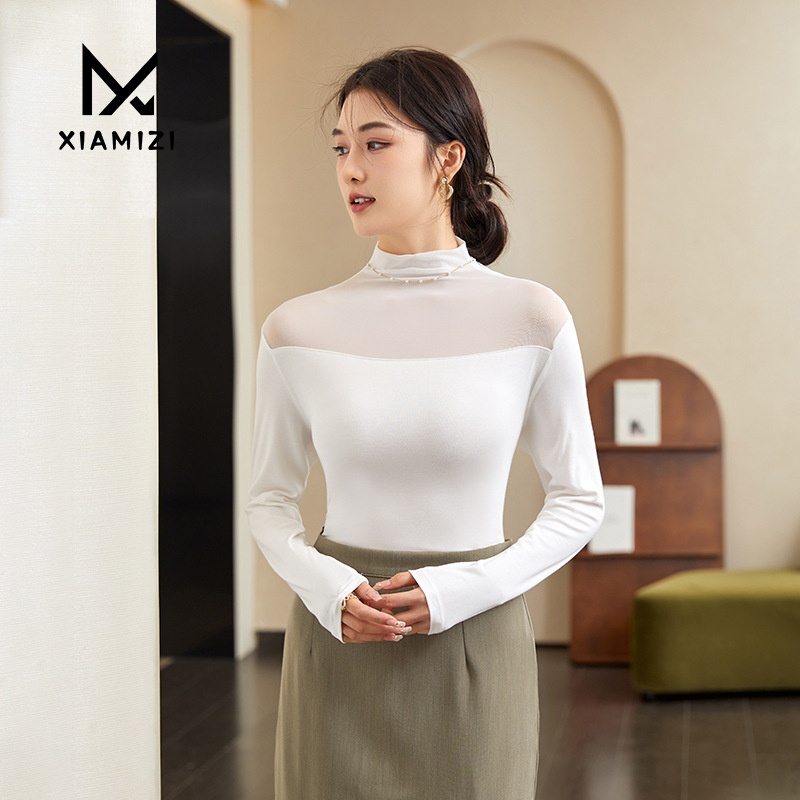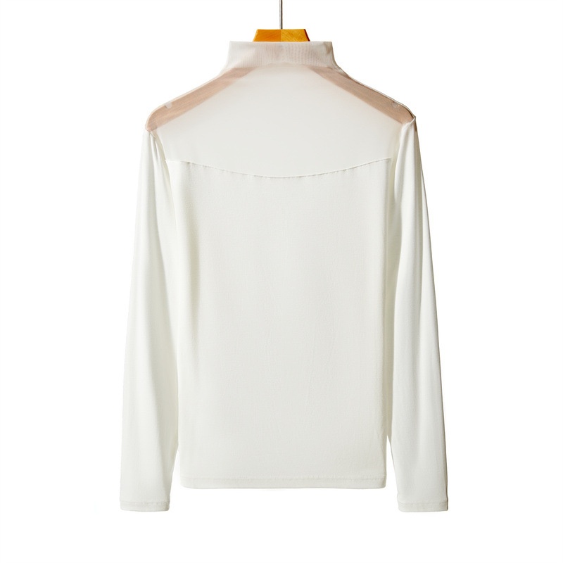 Autumn And Winter Half-high Collar Mesh Gauze Bottoming Shirt For Women,Slimming Long-sleeved Thin Transparent Gauze T-shirt Lace Top For Women