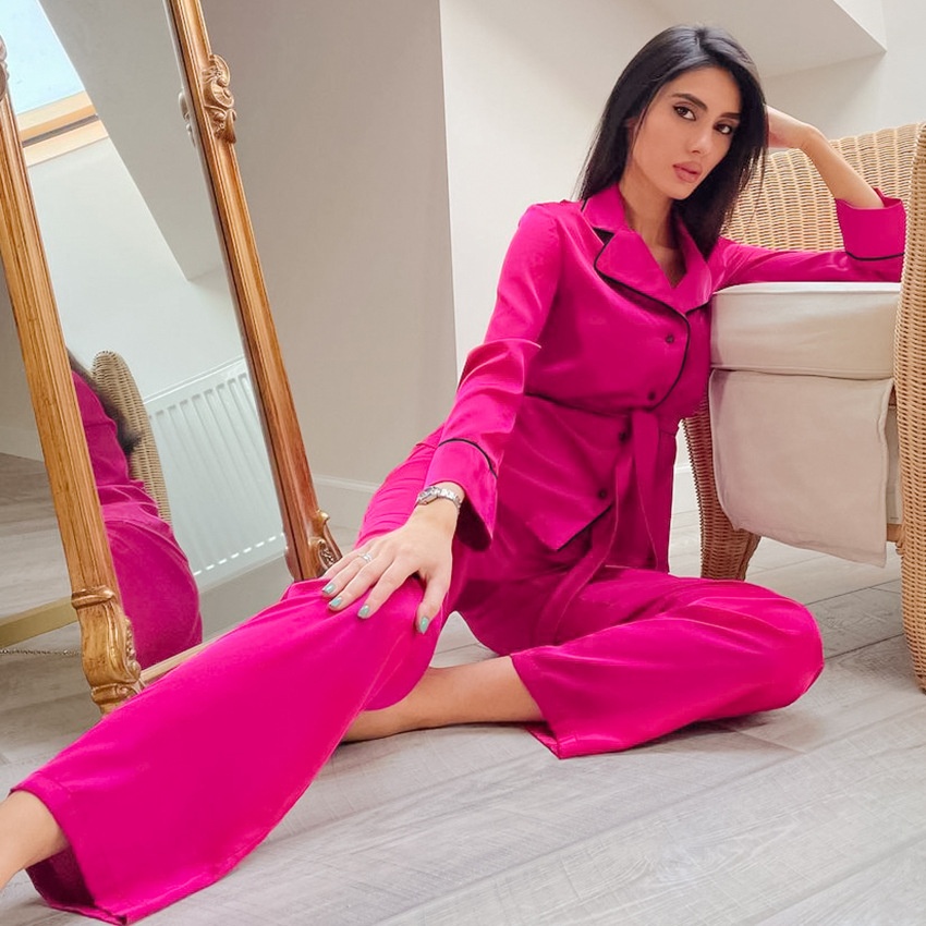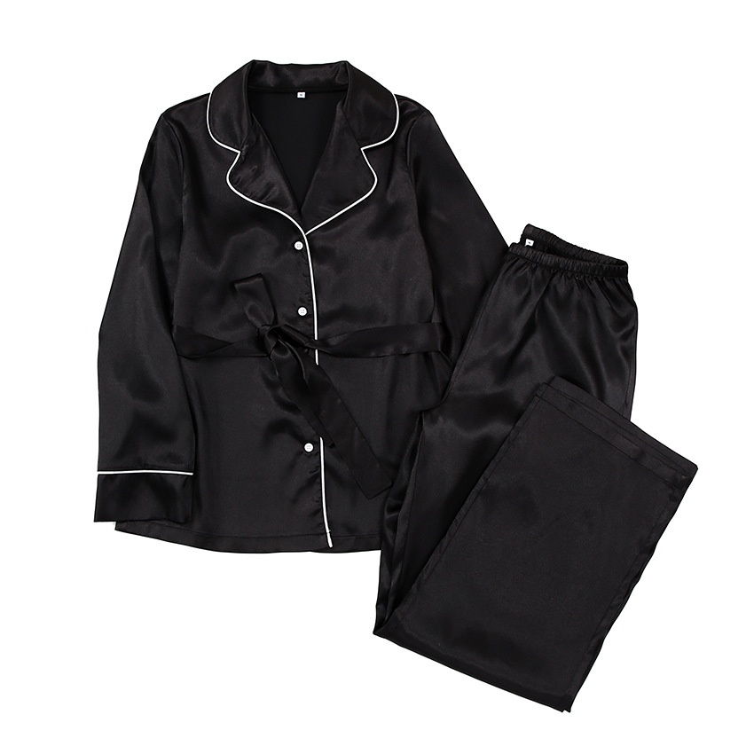 Autumn European And American Pajamas Suit Collar Satin Comfortable Long Sleeve Cardigan Nightgown Trousers Set Women's Home Clothes